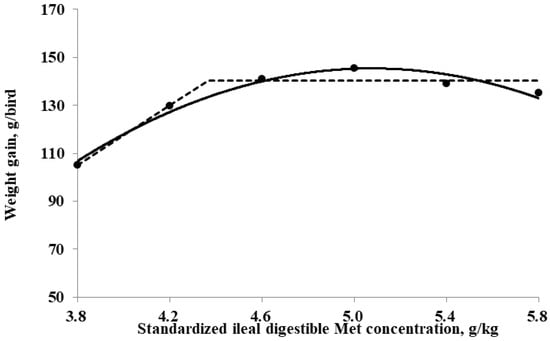 Fitted broken (dotted) and quadratic (solid) lines based on weight gain (g/bird) in 0–10-day-old broilers as a function of standardized ileal digestible (SID) Met in their diets (Experiment 1). Data points are expressed as the means of eight cages per treatment. The one-slope broken-line model indicates that the SID Met requirement was 4.4 g/kg (Y = 140.2 + 61.9 × [X − 4.4] [X < 4.4]; p = 0.01; R2 = 0.949; SE = 0.11; CI 95% = 4.0 to 4.7). The quadratic-line model shows that the SID Met requirement was 5.1 g/kg (Y = 145.5 − 23.7 × [5.1 − X] × [5.1 − X] [X < 5.1]; p = 0.01; R2 = 0.968; SE = 0.05; CI 95% = 4.98 to 5.17), and 95% of the upper asymptotic value of the quadratic model indicates that the SID Met requirement was 4.8 g/kg.