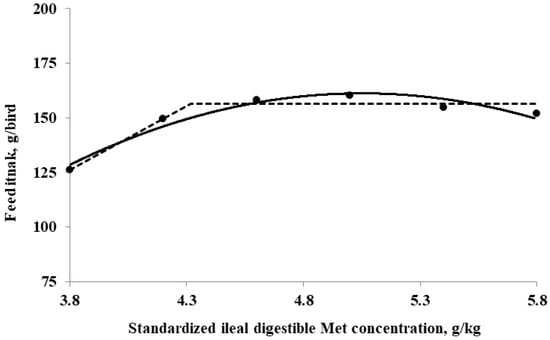 Fitted broken (dotted) and quadratic (solid) lines based on feed intake (g/bird) in 0–10-day-old broilers as a function of standardized ileal digestible (SID) Met in their diets (Experiment 1). Data points are expressed as the means of eight cages per treatment. The one-slope broken-line model indicates that the SID Met requirement was 4.3 g/kg (Y = 156.3 + 58.1 × [X − 4.3] [X < 4.3]; p = 0.01; R2 = 0.946; SE = 0.09; CI 95% = 4.0 to 4.6). The quadratic-line model shows that the SID Met requirement was 5.1 g/kg (Y = 161.2 − 20.9 × [5.1 − X] × [5.1 − X] [X < 5.1]; p = 0.01; R2 = 0.947; SE = 0.09; CI 95% = 4.87 to 5.23), and 95% of the upper asymptotic value of the quadratic model indicates that the SID Met requirement was 4.8 g/kg.