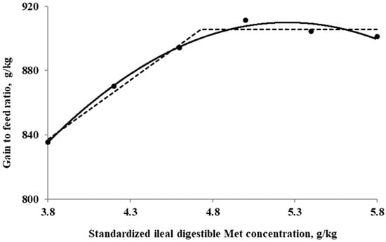 Fitted broken (dotted) and quadratic (solid) lines based on the gain-to-feed ratio (g/kg) in 0–10-day-old broilers as a function of standardized ileal digestible (SID) Met in the diet (Experiment 1). Data points are expressed as the means of eight cages per treatment. The one-slope broken-line model indicates that the SID Met requirement was 4.7 g/kg (Y = 906 + 73.9 × [X − 4.7] [X < 4.7]; p = 0.002; R2 = 0.983; SE = 0.08; CI 95% = 4.46 to 4.99). The quadratic-line model shows that the SID Met requirement was 5.3 g/kg (Y = 910 − 35.2 × [5.3 − X] × [5.3 − X] [X < 5.3]; p < 0.01; R2 = 0.991; SE = 0.06; CI 95% = 5.08 to 5.43), and 95% of the upper asymptotic value of the quadratic model indicates that the SID Met requirement was 5.0 g/kg.