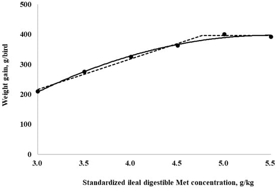 Fitted broken (dotted) and quadratic (solid) lines based on weight gain (g/bird) in 10–21-day-old broilers as a function of standardized ileal digestible (SID) Met in the diet (Experiment 2). Data points are expressed as the means of eight cages per treatment. The one-slope broken-line model indicates that the SID Met requirement was 4.8 g/kg (Y = 396.0 + 101.6 × [X − 4.8] [X < 4.8]; p = 0.0008; R2 = 0.991; SE = 0.11; CI 95% = 4.4 to 5.1). The quadratic-line model shows that the SID Met requirement was 5.5 g/kg model (Y = 396.9 − 30.0 × [5.5 − X] × [5.5 − X]; p < 0.01; R2 = 0.993; SE = 0.24; CI 95% = 4.8 to 6.2), and 95% of the upper asymptotic value of the quadratic model indicates that the SID Met requirement was 5.2 g/kg.