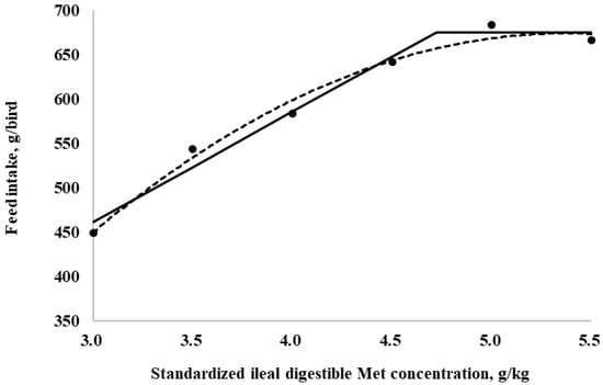Fitted broken (dotted) and quadratic (solid) lines based on feed intake (g/bird) in 10–21-day-old broilers as a function of standardized ileal digestible (SID) Met in the diet (Experiment 2). Data points are expressed as the means of eight cages per treatment. The one-slope broken-line model indicates that the SID Met requirement was 4.7 g/kg (Y = 674.6 + 123.8 × [X − 4.7] [X < 4.7]; p = 0.003; R2 = 0.980; SE = 0.16; CI 95% = 4.2 to 5.2). The quadratic-line model shows that the SID Met requirement was 5.4 g/kg model (Y = 673.7 − 39.6 × [5.4 − X] × [5.4 − X]; p < 0.01; R2 = 0.984; SE = 0.28; CI 95% = 4.5 to 6.3), and 95% of the upper asymptotic value of the quadratic model indicates that the SID Met requirement was 5.1 g/kg.