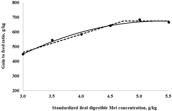 Fitted broken (dotted) and quadratic (solid) lines based on the gain-to-feed ratio (g/kg) in 10–21-day-old broilers as a function of standardized ileal digestible (SID) Met in the diet (Experiment 2). Data points are expressed as the means of eight cages per treatment. The one-slope broken-line model indicates that the SID Met requirement was 4.7 g/kg (Y = 674.6 + 123.8 × [X − 4.7] [X < 4.7]; p = 0.003; R2 = 0.980; SE = 0.15; CI 95% = 4.2 to 5.2). The quadratic-line model shows that the SID Met requirement was 5.4 g/kg (Y = 673.7 − 39.7 × [5.4 − X] × [5.4 − X] [X < 5.4]; p = 0.002; R2 = 0.981; SE = 0.03; CI 95% = 4.5 to 6.3), and 95% of the upper asymptotic value of the quadratic model indicates that the SID Met requirement was 5.1 g/kg.