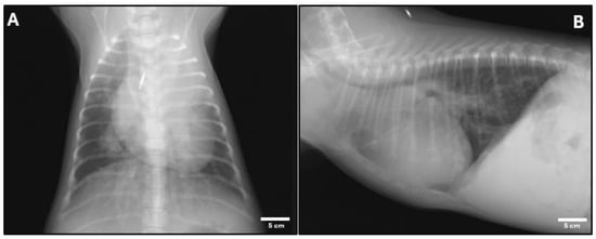 (A) Dorso-ventral view of the thoracic cavity showing ground-glass opacities in the right caudal lung lobe and atelectasis in the cranial left lung lobe. (B) Right lateral view showing an enlarged cardiac silhouette and elevation of the tracheal carina.
