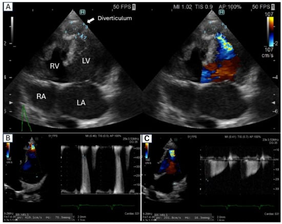 - Hajsadeghi, S.; Pazoki, M.; Talebitaher, M.; Iranpour, A. Giant Congenital Left Ventricular Diverticulum Associated with Infective Endocarditis: A Diagnosis Made by Tissue Doppler Echocardiography. J. Cardiol. Cases 2016, 14, 127–129. [Google Scholar] [CrossRef] [PubMed]