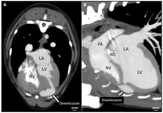 - Herráez, P.; Rodríguez, F.; Aguirre-Sanceledonio, M.; Edwards, J.F.; Suárez-Bonnet, A.; Espinosa de Los Monteros, A. Congenital Biventricular Cardiac Diverticula in a Dog. Vet. Pathol. 2011, 48, 456–459. [Google Scholar] [CrossRef] [PubMed]