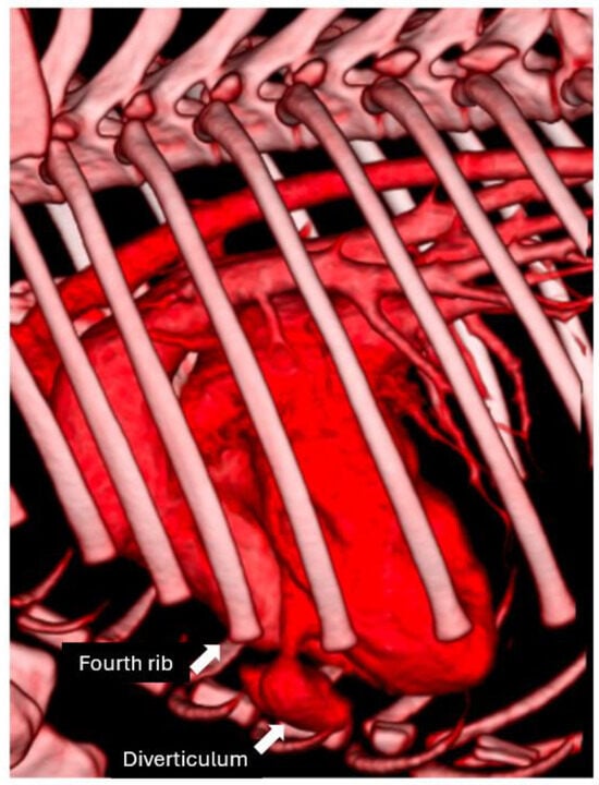 Three-dimensional reconstruction of cardiac synchronous CT. The 3D image depicts the position of the diverticulum relative to the sternum and ribs, emphasizing its dynamic changes during the cardiac cycle.