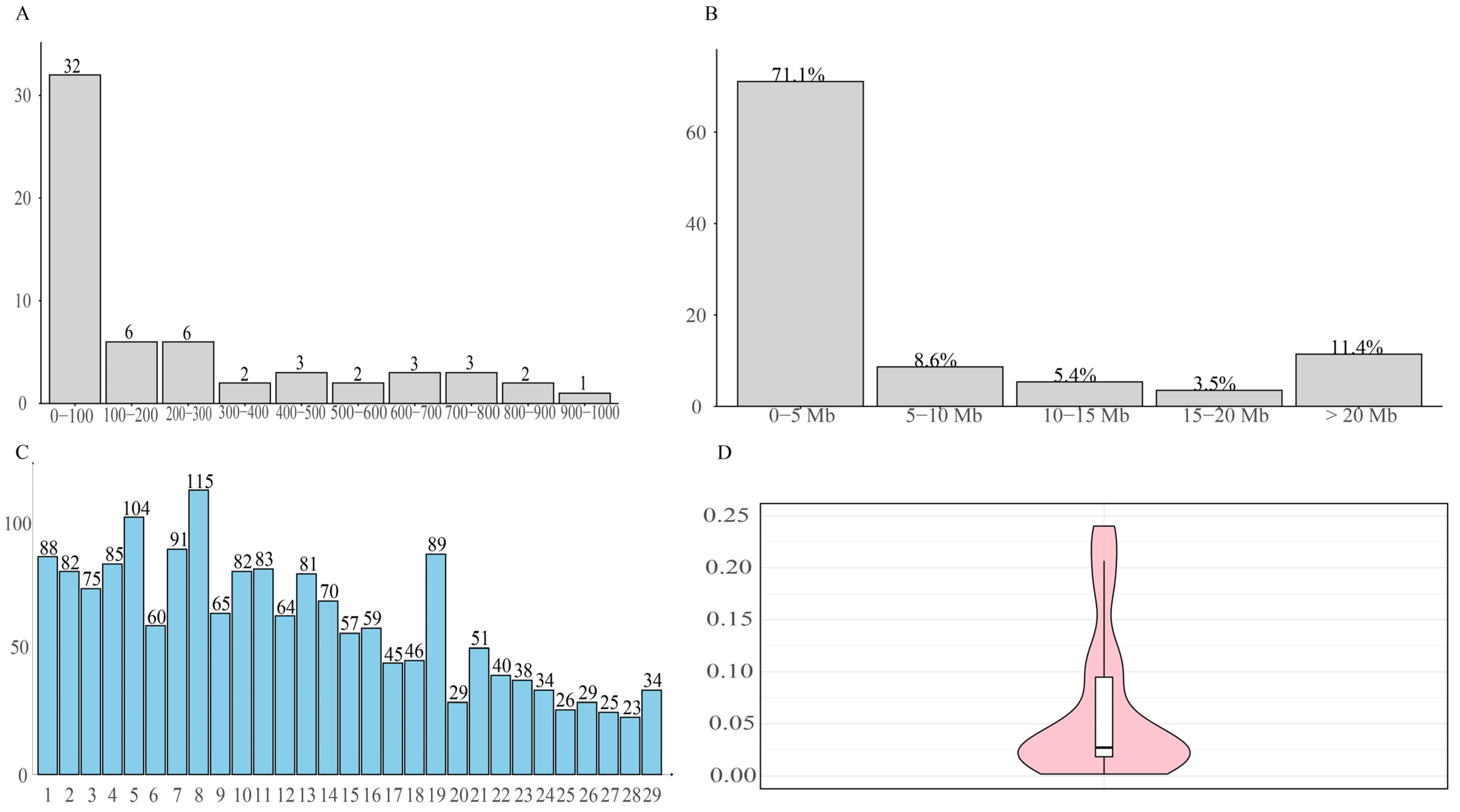- Overall, a total of 1770 ROHs were detected in 74 Dengchuan cattle, yielding an average of 29.50 ± 12.43(SD) ROHs per individual. This finding indicates significant variability in the presence of pure fragments among individuals within the population.