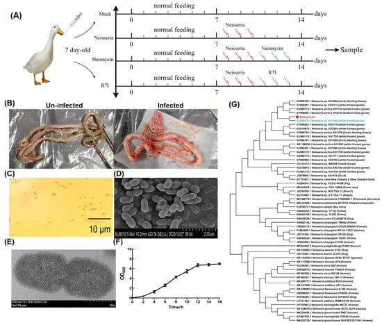 Isolation and characterization of Neisseria S1 strain. (A) The immune program of this study. (B) Pathological results of infected geese. The intestines were swollen in infected geese. (C) The Gram staining results of the isolated strain. The isolated strain is a kind of Gram-negative bacteria. (D,E) Morphological observation of the isolated strain by SEM (D) and TEM (E). The isolated strain is diplococcus. (F) A one-step growth curve. 0–2 h is the lag phase, while 4–12 h is the logarithmic growth phase and 12–16 h is the plateau phase. (G) Phylogenetic analysis of 16S rDNA genes of Neisseria S1 strain and other strains found in GenBank. Neisseria S1 (the red one) has the highest sequence homology to the strain KH1483 (the blue one).