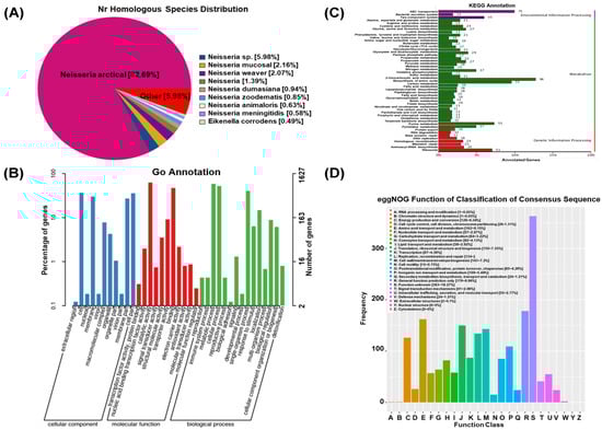 Whole-genome sequences analysis of Neisseria S1. (A) Nr homologous species distribution. (B) GO annotated classification statistics chart. (C) Classification of KEGG metabolic pathways. (D) Histogram of eggNOG classification statistics.