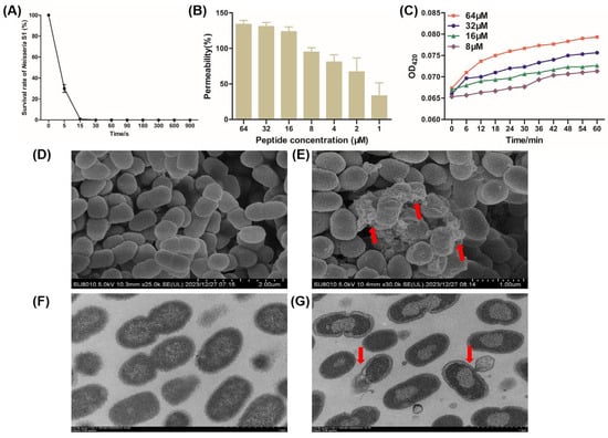 The mechanism of peptide R7I against Neisseria in vitro. (A) Time-to-kill kinetic curves of the peptide at 1 × MBC against Neisseria S1. Neisseria S1 was basically completely killed within 15 s, indicating that R7I has extremely high antibacterial efficiency. (B) The outer membrane permeability induced by R7I. An NPN uptake assay was used to detect the penetration ability of Neisseria S1 in the presence of different concentrations of R7I. The degree of damage to the Neisseria outer membrane is positively correlated with the concentration of R7I. (C) The inner membrane permeability induced by R7I. An ONPG release assay was used to detect the inner membrane permeability of Neisseria S1 in the presence of different concentrations of R7I. R7I induced an increase in inner membrane permeability rapidly at a low concentration. (D–G) Morphological observation of Neisseria S1 by SEM (D,E) and TEM (F,G) in the presence of R7I. (D,F) Neisseria S1. (E,G) Neisseria S1 treated with R7I. Red arrows in (E,G) indicate the release of the contents in the bacteria.