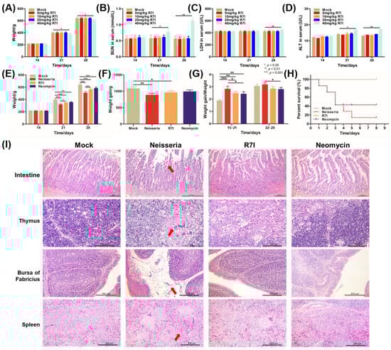 Daily measurements of body weight, weight gain, and survival rates of each group were recorded. On the 7th day post-infection, the intestines, thymus, bursa of Fabricius, and spleen from each group were collected, and histopathological changes were assessed via pathoanatomical analysis and hematoxylin–eosin (HE) staining carried out by the Harbin Veterinary Research Institute. The pathologists were blind to the clinical grouping (e.g., Neisseria infection group, or R7I treatment group) during the evaluation process. In addition, pathological evaluation followed the previous grading standards of the Harbin Veterinary Research Institute, including classification criteria for inflammation severity, cell damage, and cell infiltration, and was performed by two professionals who made separate judgments. Blood and intestinal mucosal lavage fluid from each group were collected and kept at −80 °C for further analysis. The infection process is shown in Figure 1A, created using Figdraw (https://www.figdraw.com/).