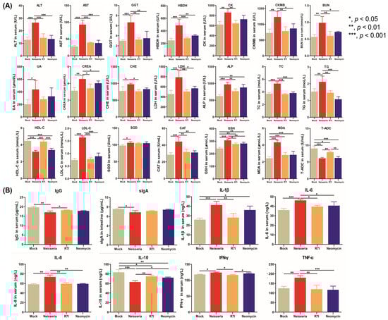 The levels of lipid metabolism-associated indexes (TC, TG, HDL-C, and LDL-C) and antioxidant-associated indexes (SOD, CAT, T-AOC, GSH, and MDA) in serum are shown in Figure 5A; compared with the Mock group, the levels of T-AOC and HDL-C were significantly decreased (p < 0.001), while other indexes increased in the Neisseria group. R7I and Neomycin alleviated these changes caused by Neisseria infection, helping to restore antioxidative balance and correct lipid metabolism disorders.
