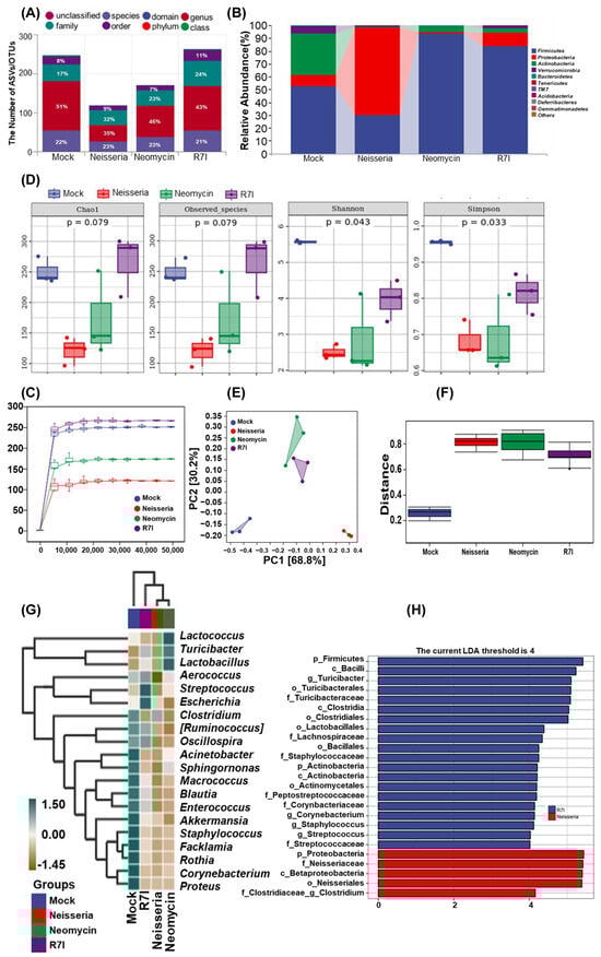 Gut microbiota analysis by 16S rDNA sequencing. (A) Statistics on the number of taxonomic units in species composition. (B) Taxonomic composition analysis at the phylum level. (C) Rarefaction curves of each group. The smoothness of the curve reflects the impact of sequencing depth on the alpha diversity index of the observed samples. The number of ASV/OTU in R7I > Mock > Neomycin and Control at the same sequencing depth. (D) The alpha diversity index. Chao1 of the observed species represents richness, while Shannon and Simpson indexes represent diversity. Significance was tested using the Kruskal–Wallis rank-sum test and Dunn’s test as a post hoc test. (E) PCA for differences in species abundance composition at the genus level. The closer the projection distance between two points on the coordinate axis, the more similar the species abundance composition between these two samples in the corresponding dimension. (F) Differences in species composition analyzed by Permdisp. (G) A species composition heatmap. Samples are clustered using UPGMA based on the Euclidean distance of species composition data and arranged according to the clustering results. (H) LDA effect size (LEfSe) analysis. The vertical axis represents the classification units with significant differences between groups, while the horizontal axis visually displays the logarithmic scores of LDA analysis for each classification unit in a bar chart. Classification units are sorted according to their score values to describe their specificity in sample grouping. The longer the length, the more significant the difference in the classification unit.