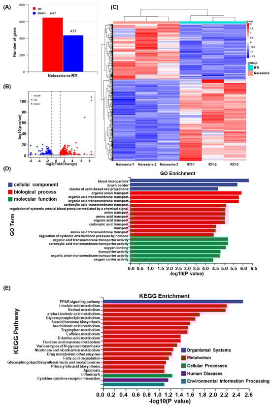 On the 7th day post infection, the intestines of each group were collected, and then preserved with dry ice and transported to the laboratory for sequencing. Sequencing was performed by Shanghai Personal Biotechnology Co., Ltd., Shanghai, China. In brief, the total RNA from the intestines of the Neisseria and R7I groups was extracted by using TRIzol reagent (15596026CN, Thermo Scientific, USA) according to the manufacturer’s instructions. Subsequently, the cDNA libraries were constructed and sequenced using the Illumina NovaSeq platform. The filtered reads were aligned to the goose reference genome (GCF_000971095.1_AnsCyg_PRJNA183603_v1.0_genomic.fna) using HISAT2 software (http://ccb.jhu.edu/software/hisat2/index.shtml). FPKM (Fragments Per Kilo bases per Million fragments) were used for normalization, and genes with FPKM > 1 were considered to be expressed. DESeq was used to analyze gene expression differences, and the genes with a |log2FoldChange| > 1 and p-value < 0.05 were identified as significantly differentially expressed genes (DEGs). Gene ontology (GO) database analysis (p-value < 0.05) was used for differential gene functional annotation, while the Kyoto Encyclopedia of Genes and Genomes (KEGG) database analysis (p-value < 0.05) was used to identify the differential enrichment pathways.