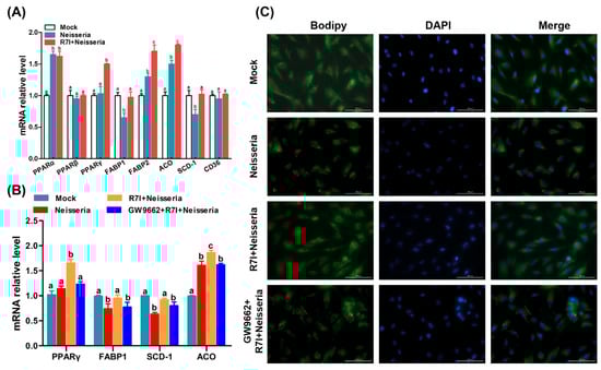 To determine whether R7I regulated lipid metabolism through the PPAR signaling pathway, cells were treated with GW9662 (PPARγ inhibitor, MCE, Shanghai, China, 10 μM). After 6 h, cells were infected with Neisseria S1 (MOI = 10), and after 6 h, cells were incubated with R7I (16 μM) and collected after 12 h. Expression of lipid metabolism pathway relative genes was detected by qRT-PCR. Furthermore, the lipid droplet of each group was marked by using the Lipid Droplets Green Fluorescence Assay Kit with BODIPY (Beyotime, China) and observed with a fluorescent microscope.