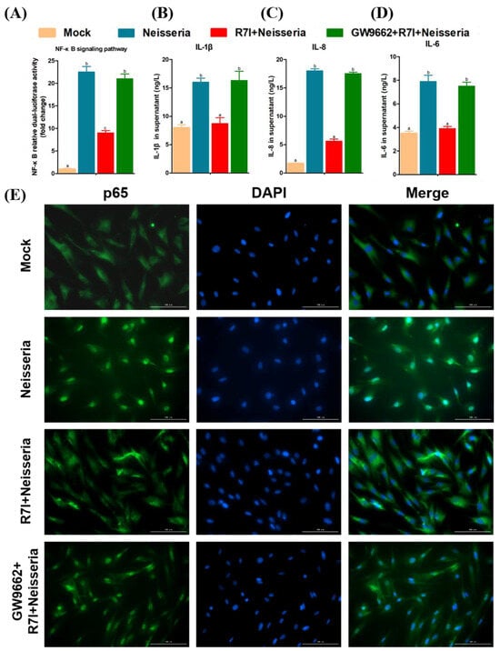 To determine whether R7I regulated the inflammatory response through the PPAR signaling pathway, cells in 24-well plates were transfected with the pNF-κB-luc reporter plasmid (0.44 μg/well) and internal reference plasmid pRL-TK (0.06 μg/well) using lipofectamine® LTX & Plus Reagent (Invitrogen, Waltham, MA, USA). At 12 h post transfection, cells were treated with GW9662 for 6 h. Subsequently, cells were infected with Neisseria S1 (MOI = 10) for 6 h, followed by incubation with R7I (16 μM), and were collected after 12 h. The firefly luciferase and the Renilla luciferase activities of each group were detected using a Dual-Luciferase® Reporter Assay System (Promega, Madison, WI, USA). Subsequently, the expression of inflammatory cytokines (IL-1β, IL-6, and IL-8) was determined by using ELISA kits according to the manufacturer’s instructions.