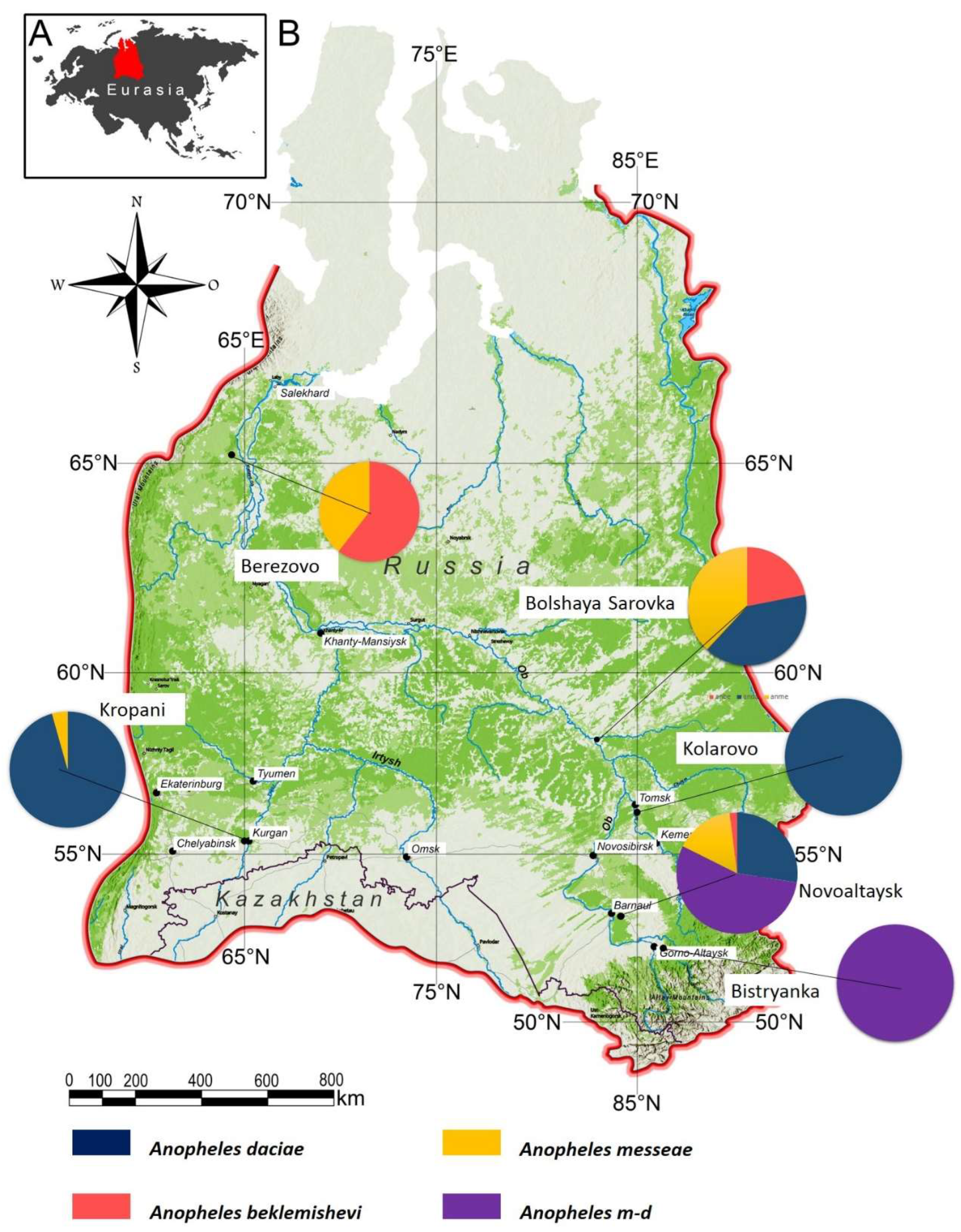 - Brusentsov, I.I.; Gordeev, M.I.; Yurchenko, A.A.; Karagodin, D.A.; Moskaev, A.V.; Hodge, J.M.; Burlak, V.A.; Artemov, G.N.; Sibataev, A.K.; Becker, N.; et al. Patterns of genetic differentiation imply distinct phylogeographic history of the mosquito species Anopheles messeae and Anopheles daciae in Eurasia. Mol. Ecol. 2023, 32, 5609–5625. [Google Scholar] [CrossRef] [PubMed]