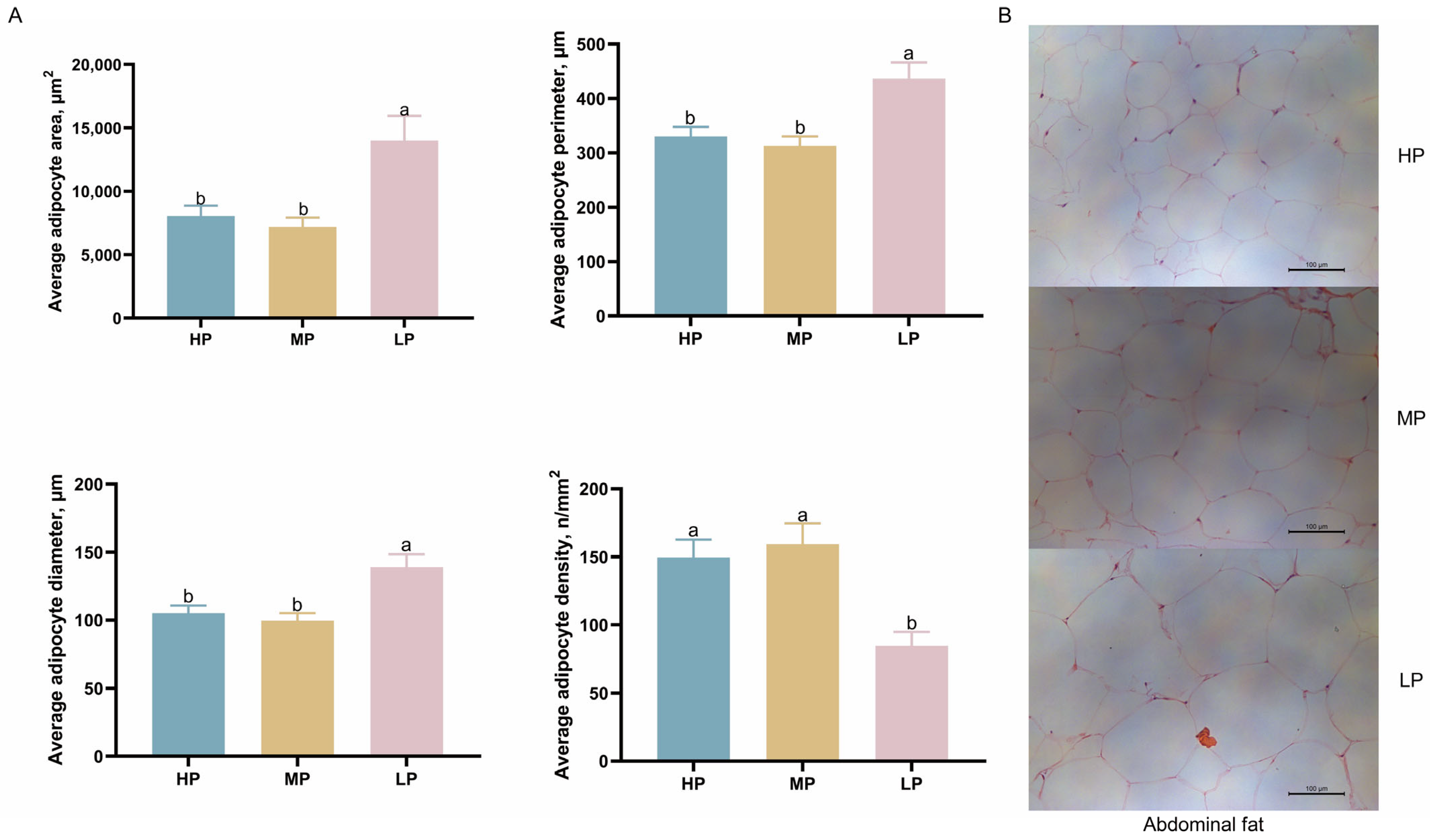 3.3. Effect of Dietary CP Levels on Adipocyte Morphology in Ningxiang Finishing Pigs