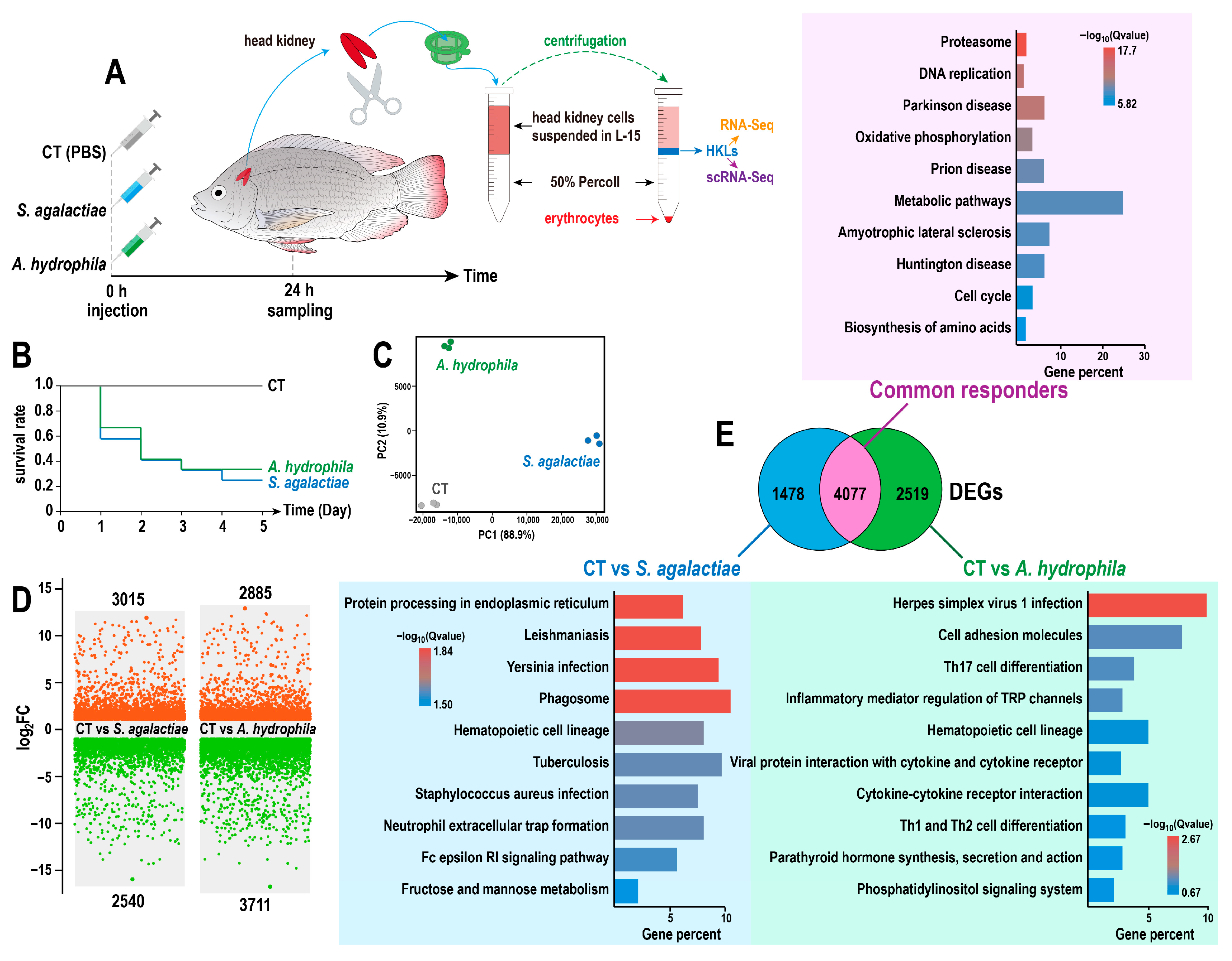 Li, Q.; Fang, Z.; Li, Z.; Wei, X.; Wei, Y. RNA-Seq and Single-Cell RNA-Seq Analyses of Tilapia Head Kidney in Response to Streptococcus agalactiae and Aeromonas hydrophila. Animals 2025, 15, 2951. https://doi.org/10.3390/ani15202951