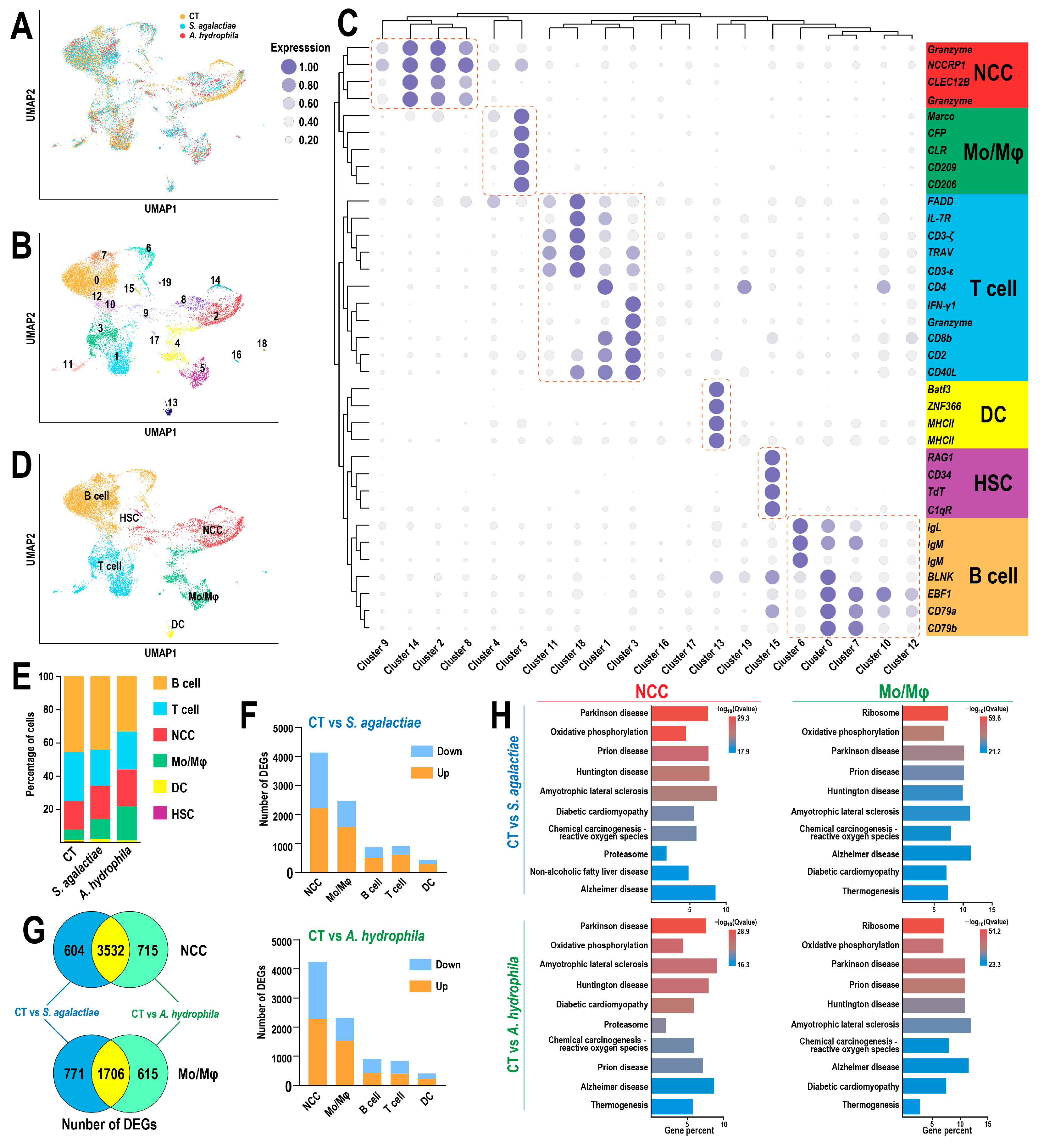 3.2. ScRNA-Seq of HKLs Indicated NCCs and Mos/Mφs Were Central Defenders