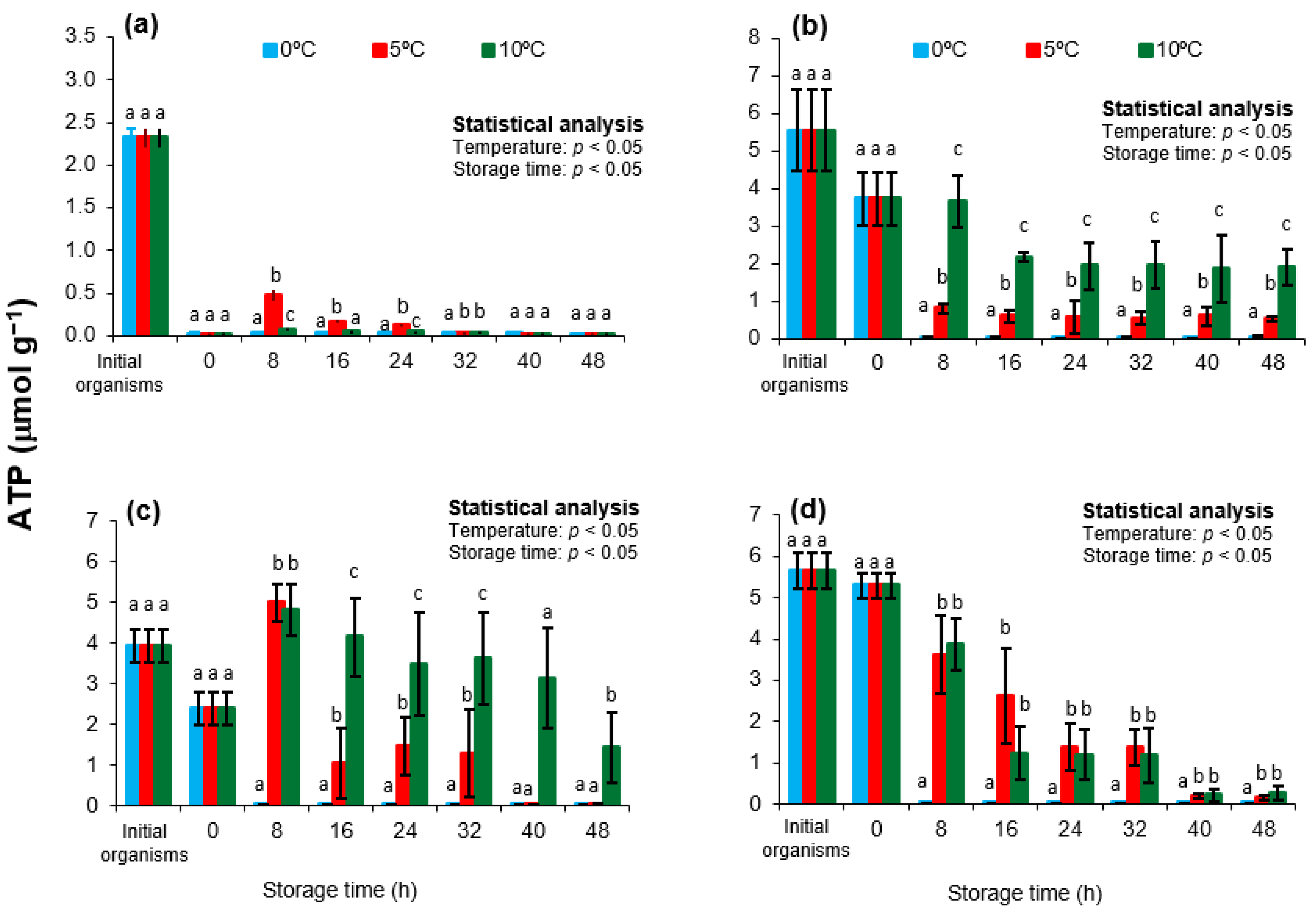 - Zhang, Y.; Li, H.; Zhao, C.; Sun, F. Effect of temperature on ATP degradation and rigor mortis in the adductor muscle of Pecten maximus. Aquaculture 2022, 548, 737592. [Google Scholar]