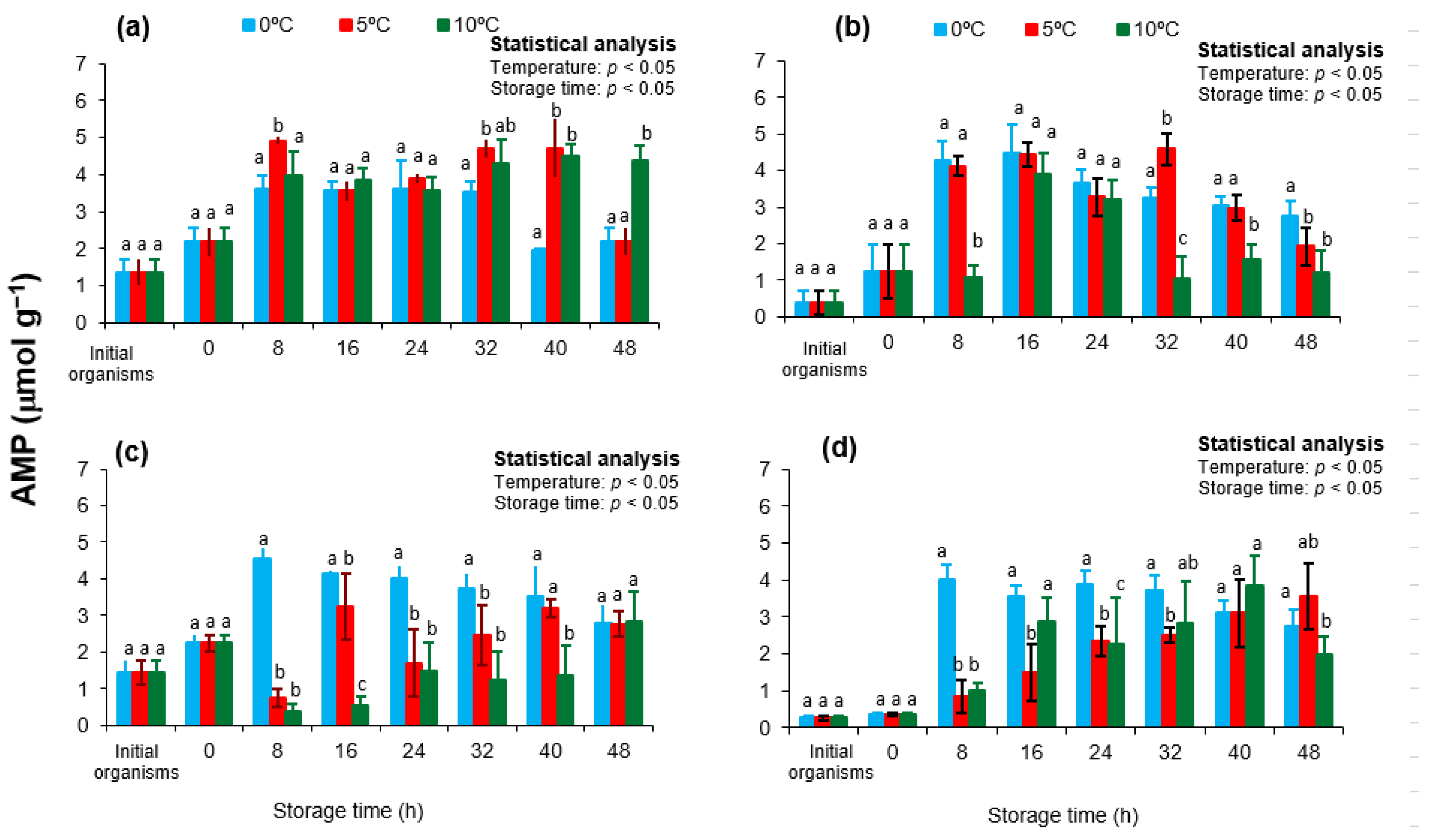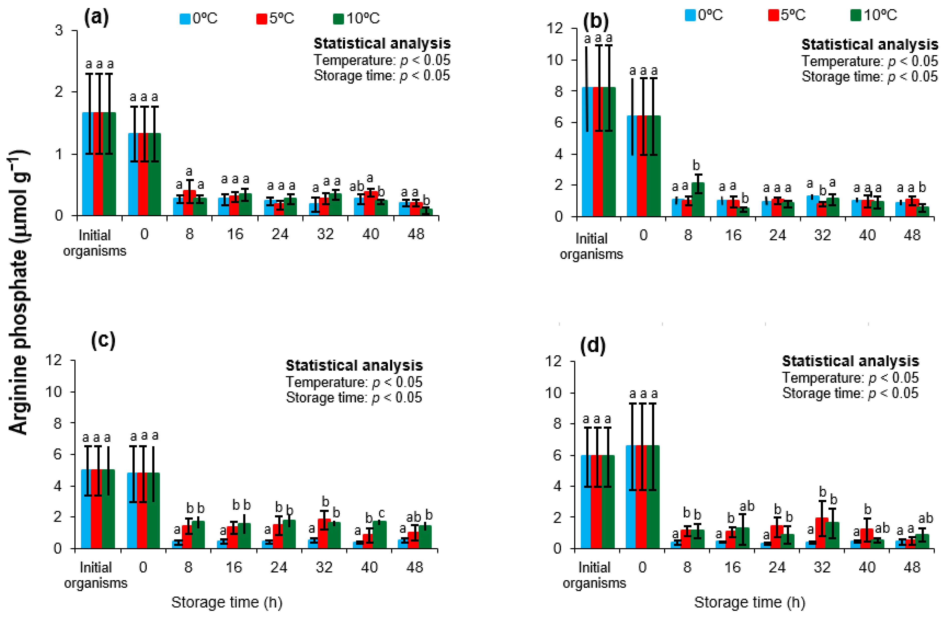 - Yokoyama, Y.; Sakaguchi, M.; Kawai, F.; Kanamori, M. Effects of storage temperature on postmortem changes of ATP and its related compounds and freshness indices in oyster tissues. Fish. Sci. 1994, 60, 217–223. [Google Scholar] [CrossRef]