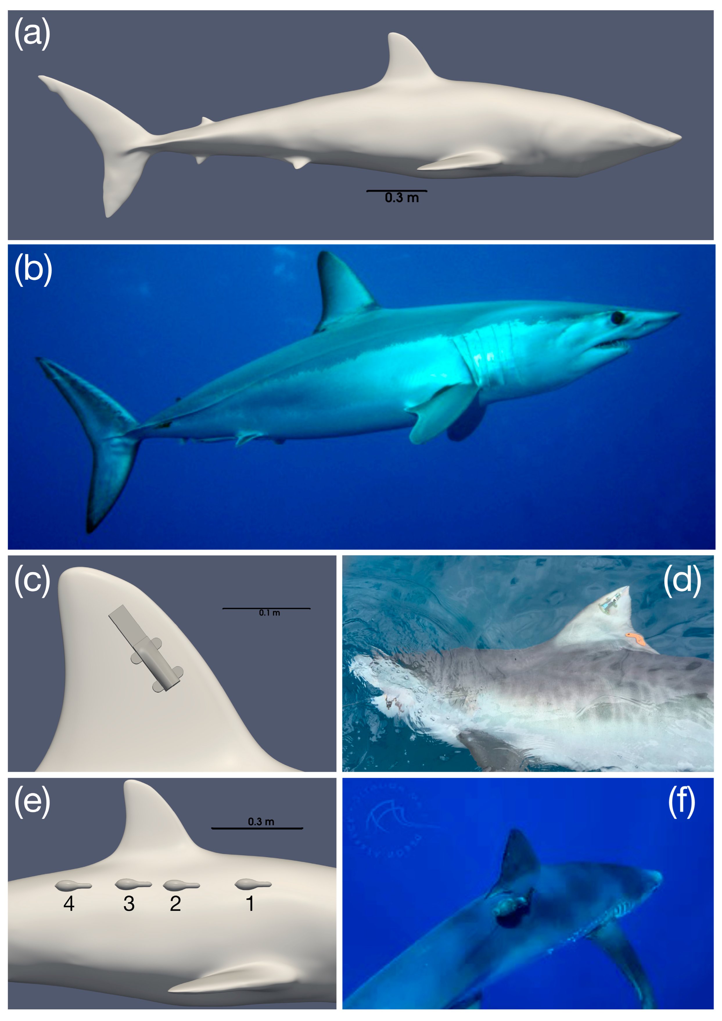 Isurus oxyrinchus), which is broadly representative of the streamlined pelagic lamniform body plan, to explore strategies for minimizing hydrodynamic impact and improving tag design. Specifically, we ask: (1) How do tag shape and placement affect hydrodynamic drag on mako sharks? (2) Can CFD modelling inform ethical thresholds for tag design in pelagic sharks?