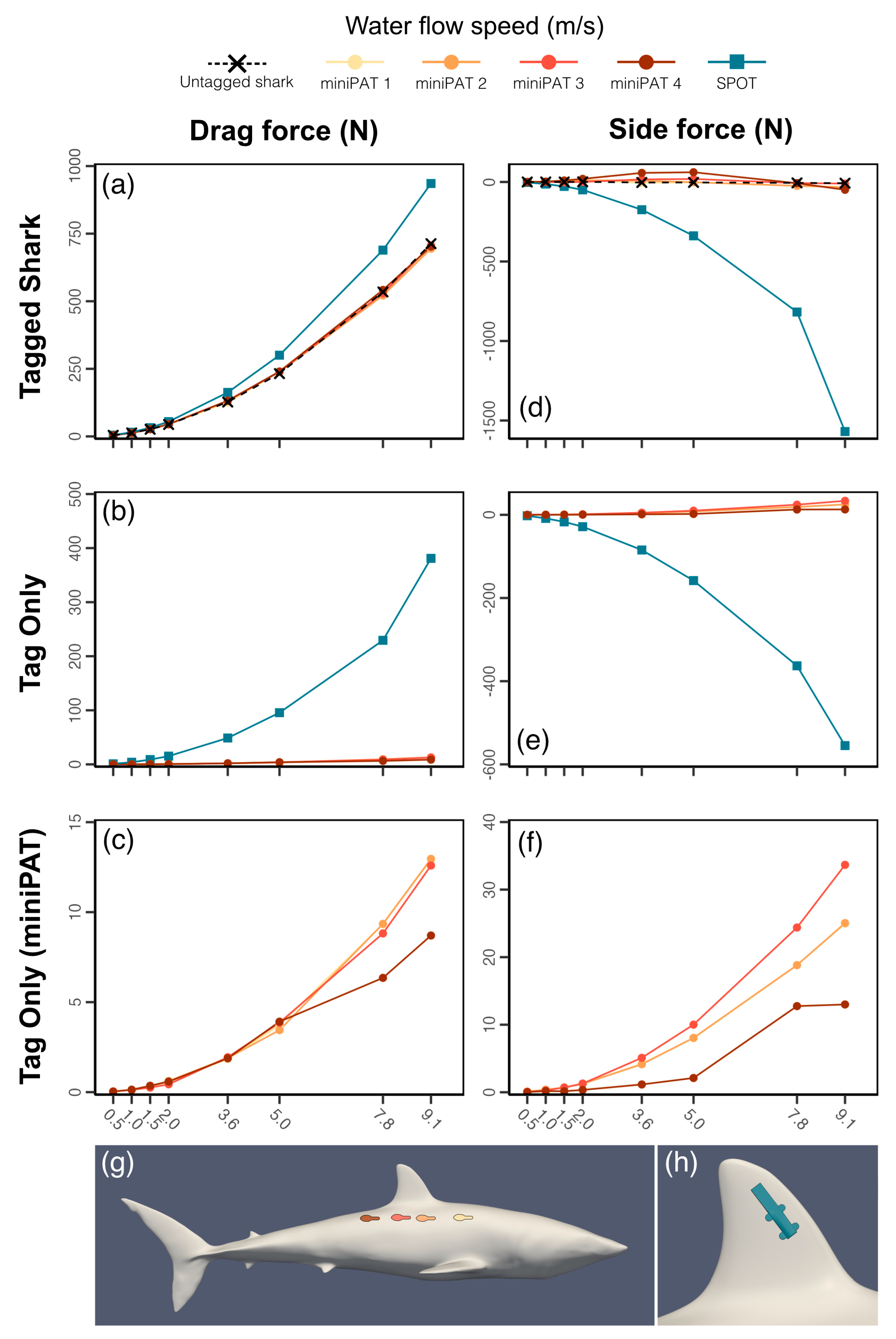 In contrast, the dorsal fin SPOT tag was found to increase the drag experienced by the shark, with a 0.7–222.7 N (17.6%–31.2%) increase in drag force across the range of flow velocities, increasing for increasing flow velocity (