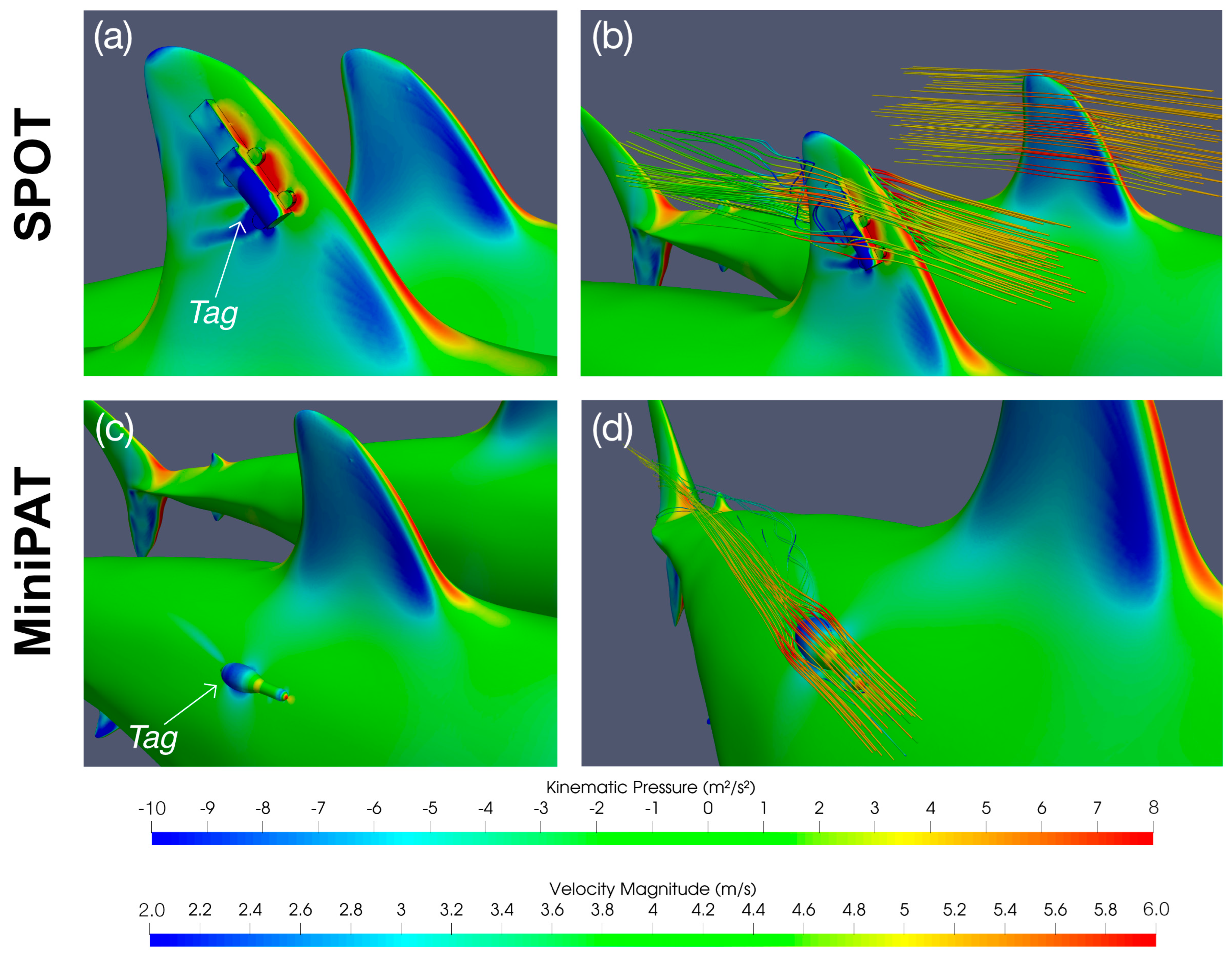 Supplementary File S1D). MiniPAT tags remain within the upstream flow boundary of the shark’s body, minimizing exposure to direct flow and reducing drag. The SPOT tag is instead attached to the dorsal fin, where it disrupts the aerofoil-like geometry and protrudes beyond the original cross-sectional area of the shark, and as such is not shielded by upstream flow structures (