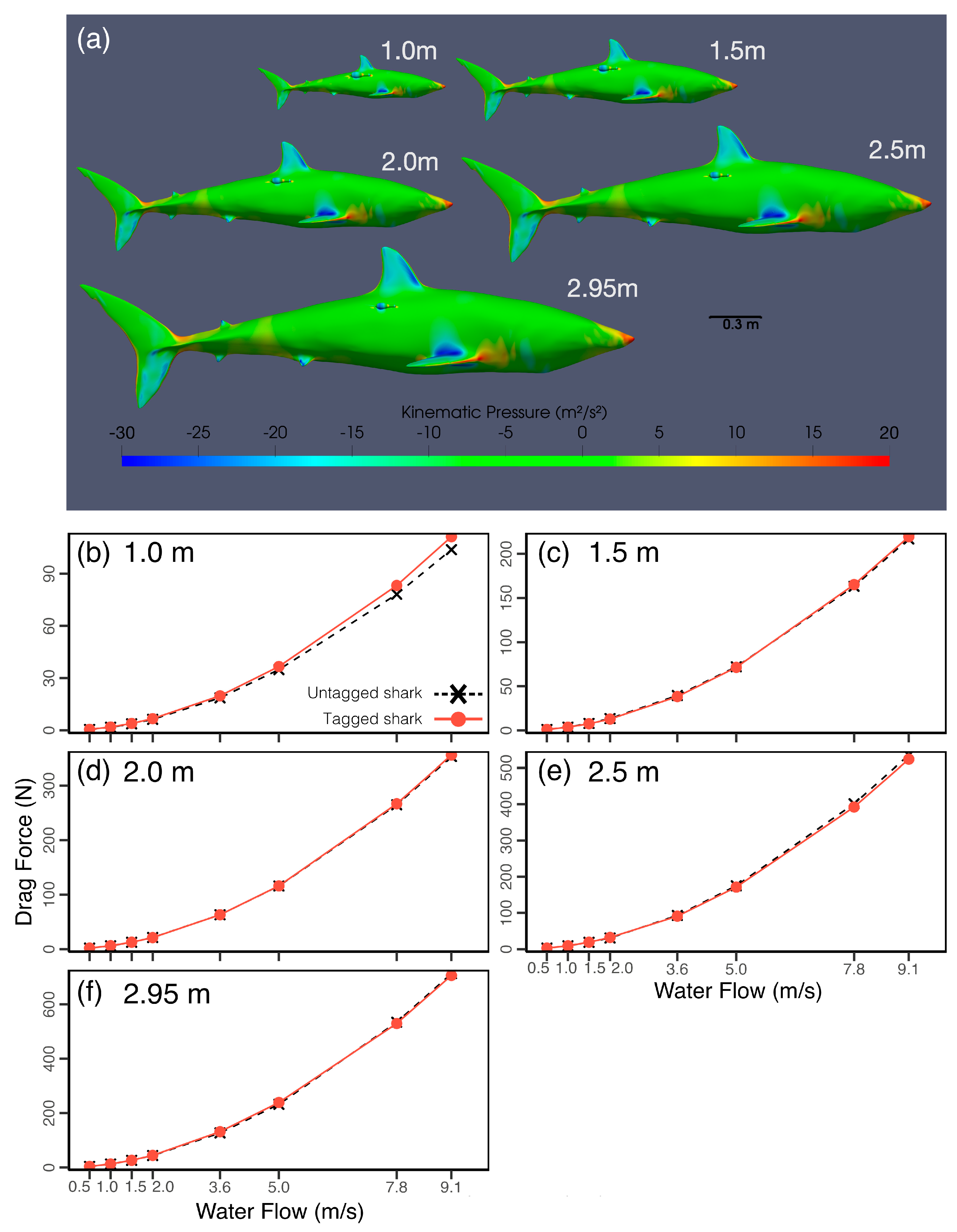 In simulations, the overall trends in drag force across the range of flow velocities tested followed a similar relationship for a range of shark sizes from 1 to 2.95 m (