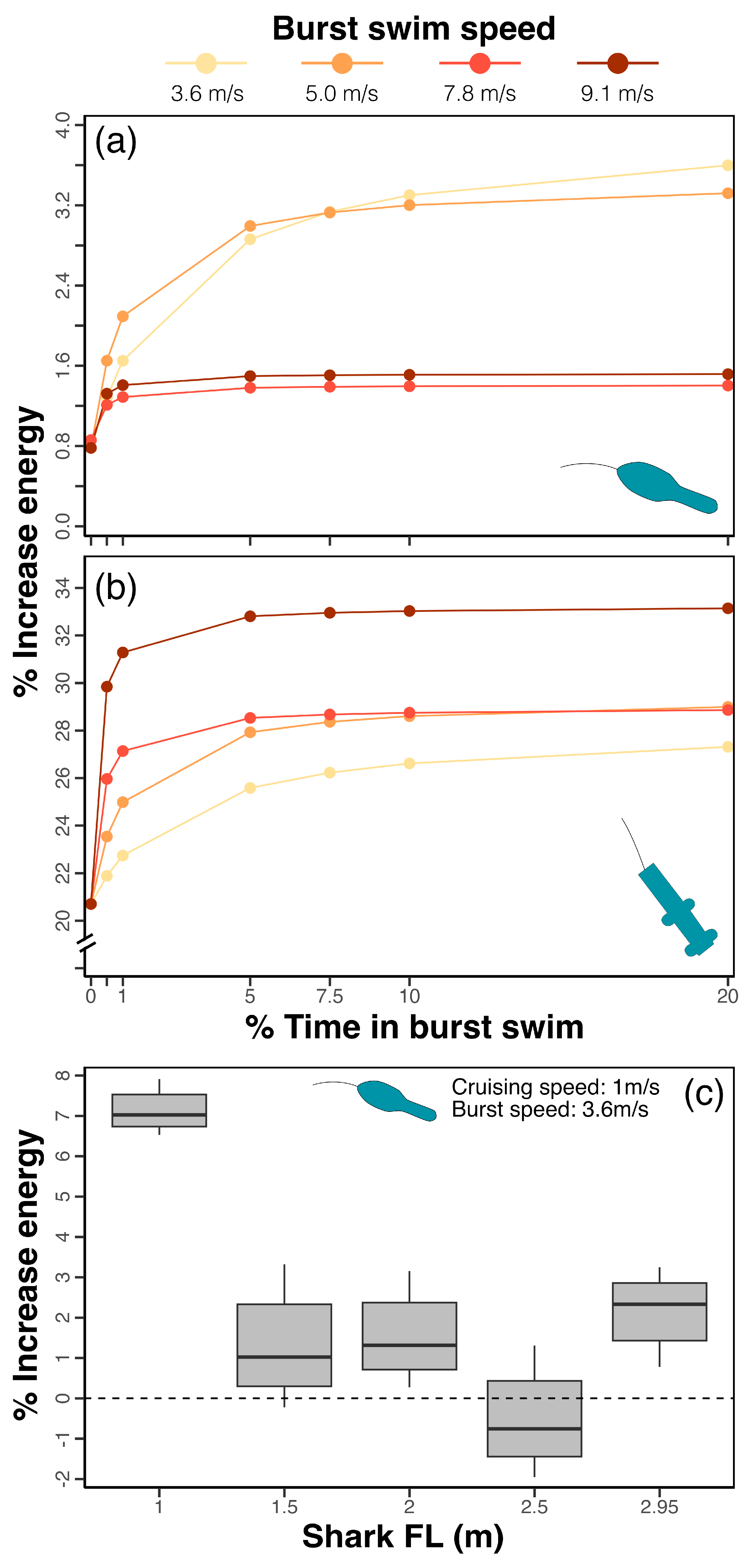 Figure 5a,b), as the drag force acting on the tag did not increase with water flow by as much as the relative drag caused by the shark itself. By contrast, SPOT tag costs varied from 20.5% (in the absence of burst swimming), up to 33% for the 9.1 m/s burst speed scenario. Energetic costs associated with SPOT tags furthermore increased with increasing burst speed (