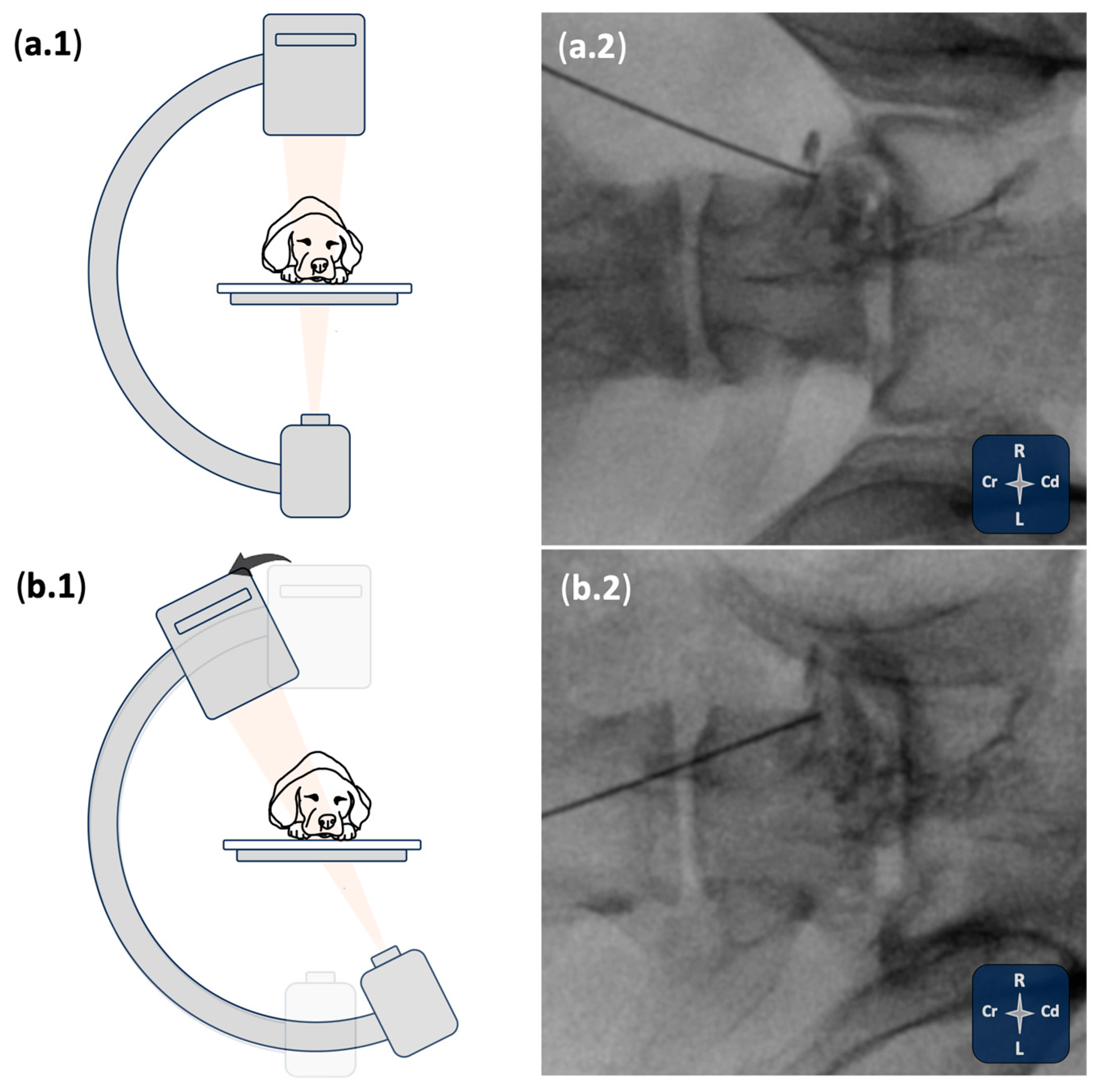 - Medina-Serra, R.; Belda, E.; López-Abradelo, P.; Zoff, A.; Sanchís-Mora, S. Radiation Exposure during Ultrasound- and Fluoroscopy-Guided Spinal Interventional Pain Management Procedures in Dogs: A Retrospective Analysis in a Single Institution. Vet Anaesth Analg 2025. [Google Scholar] [CrossRef]