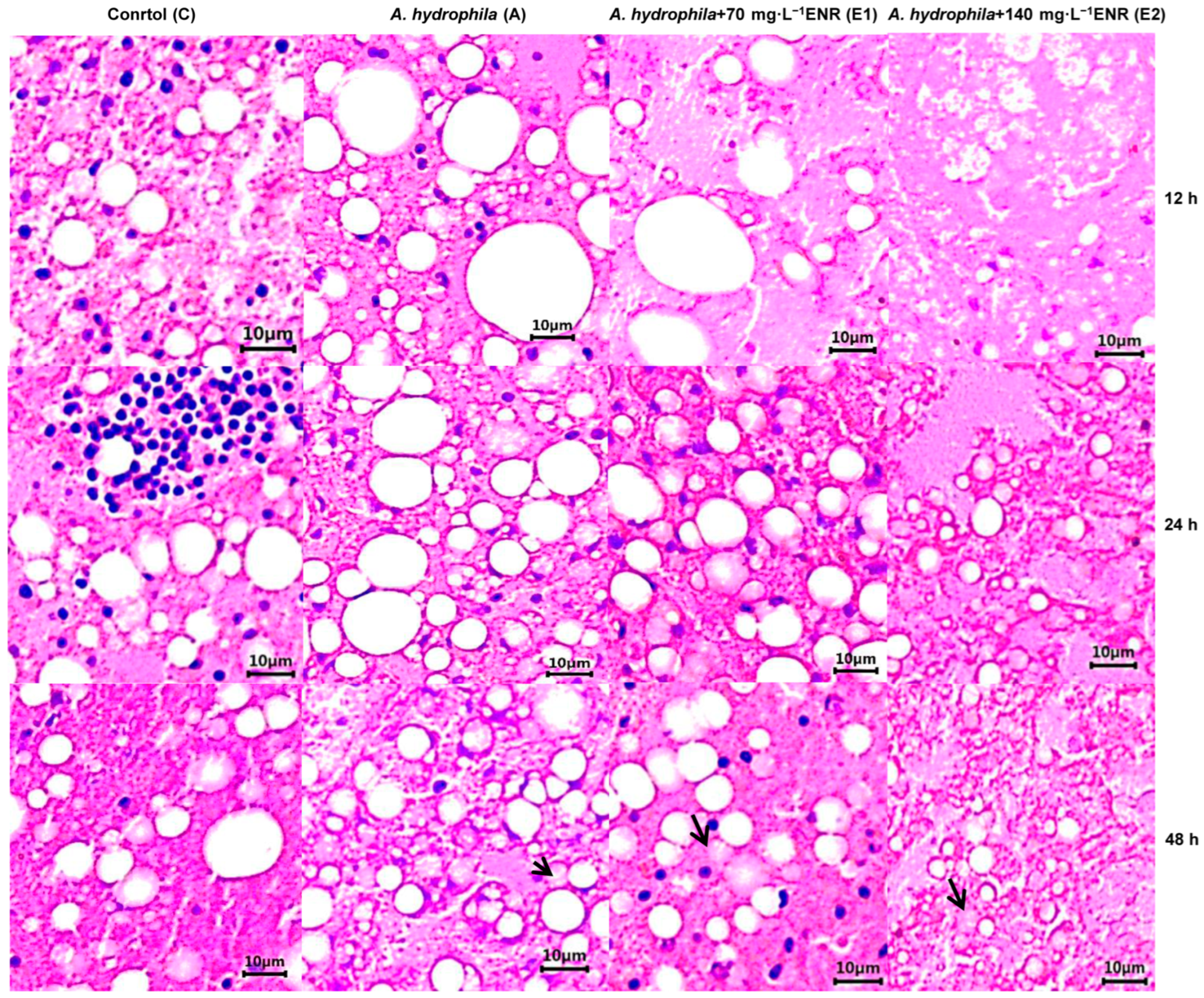 3.2. Histopathological Alterations Induced by A. hydrophila and Normal and Excessive Concentrations of the Therapeutic Drug ENR