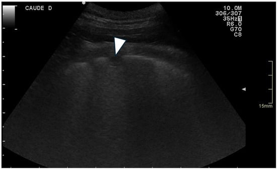 For some of these dogs, sedation or anaesthesia may be contraindicated, and a thoracic CT scan may not be performed or may not be available on site. Thoracic radiographs have a shorter acquisition time, but immobilisation in lateral recumbency might worsen respiratory distress for dogs presented with severe dyspnoea. Furthermore, radiographic images are nonspecific and do not rule out CIPF []. Ultrasonography (US) is a non-invasive, relatively inexpensive, and radiation-sparing technique that can be performed in the emergency room without transferring the patient. Thoracic ultrasonography is commonly used in veterinary medicine and human medicine as a rapid tool to diagnose pulmonary pathology [,,]. In veterinary medicine, the use of thoracic ultrasound has increased during the last decade, with the development of point-of-care ultrasonography and focused assessment with sonography for trauma [,,,,,]. Its usefulness has been especially assessed for the detection of pulmonary cardiogenic oedema and pulmonary contusions [,]. In human medicine, thoracic ultrasound is also used in the diagnosis of idiopathic pulmonary fibrosis [,,,,].