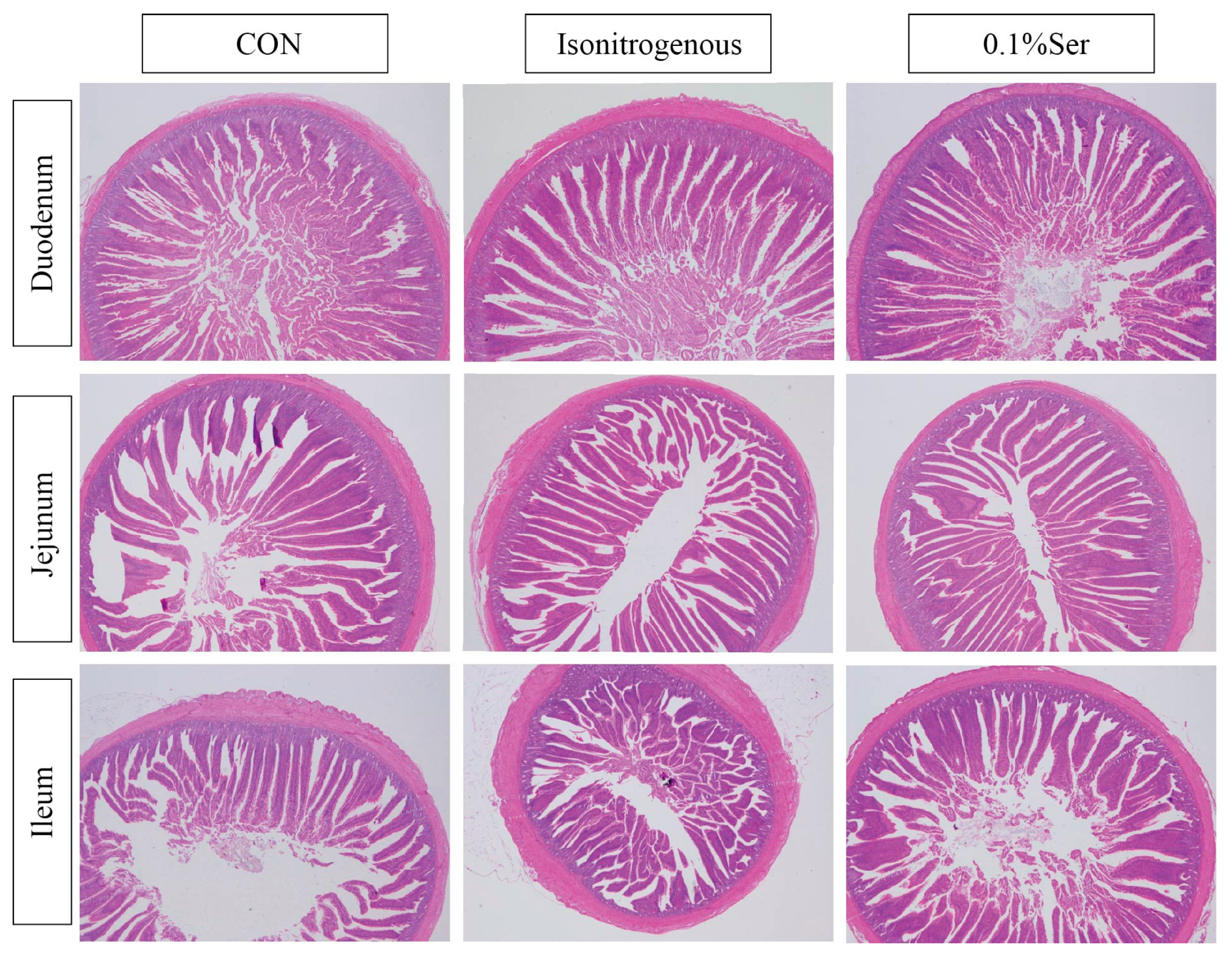 15], and it is hypothesized that serine may enhance intestinal function through conversion to glycine. The promotional effect of L-serine on intestinal development was further confirmed in our results, where the relative intestinal weights of all parts of the small intestine were significantly increased by L-serine supplementation, and the relative length of the duodenum was also enhanced compared to the other groups. Meanwhile, similar to the results of previous studies [