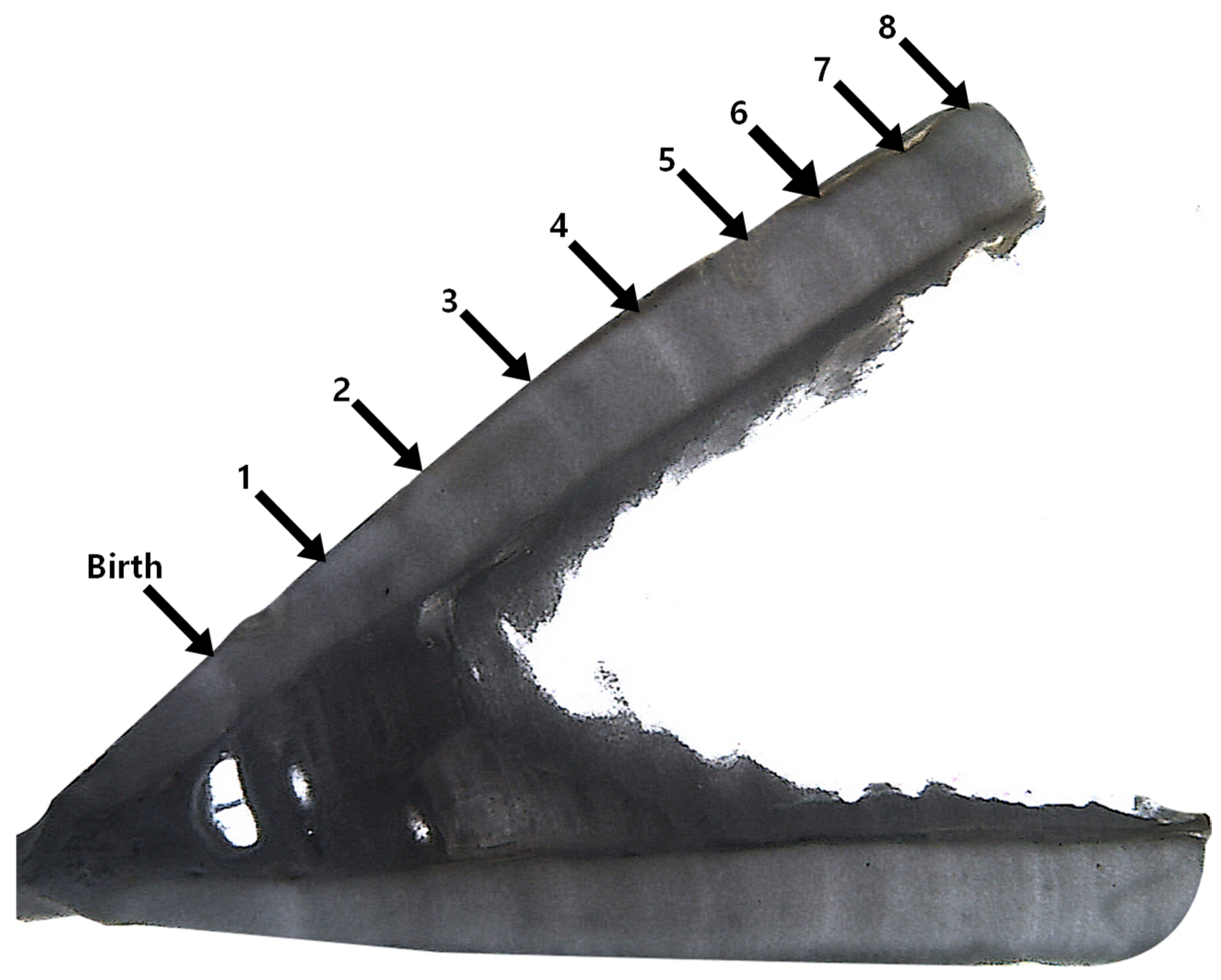 - Joung, S.-J.; Lyu, G.-T.; Hsu, H.-H.; Liu, K.-M.; Wang, S.-B. Age and growth estimates of the blue shark Prionace glauca in the central South Pacific Ocean. Mar. Freshw. Res. 2018, 69, 1346–1354. [Google Scholar] [CrossRef]