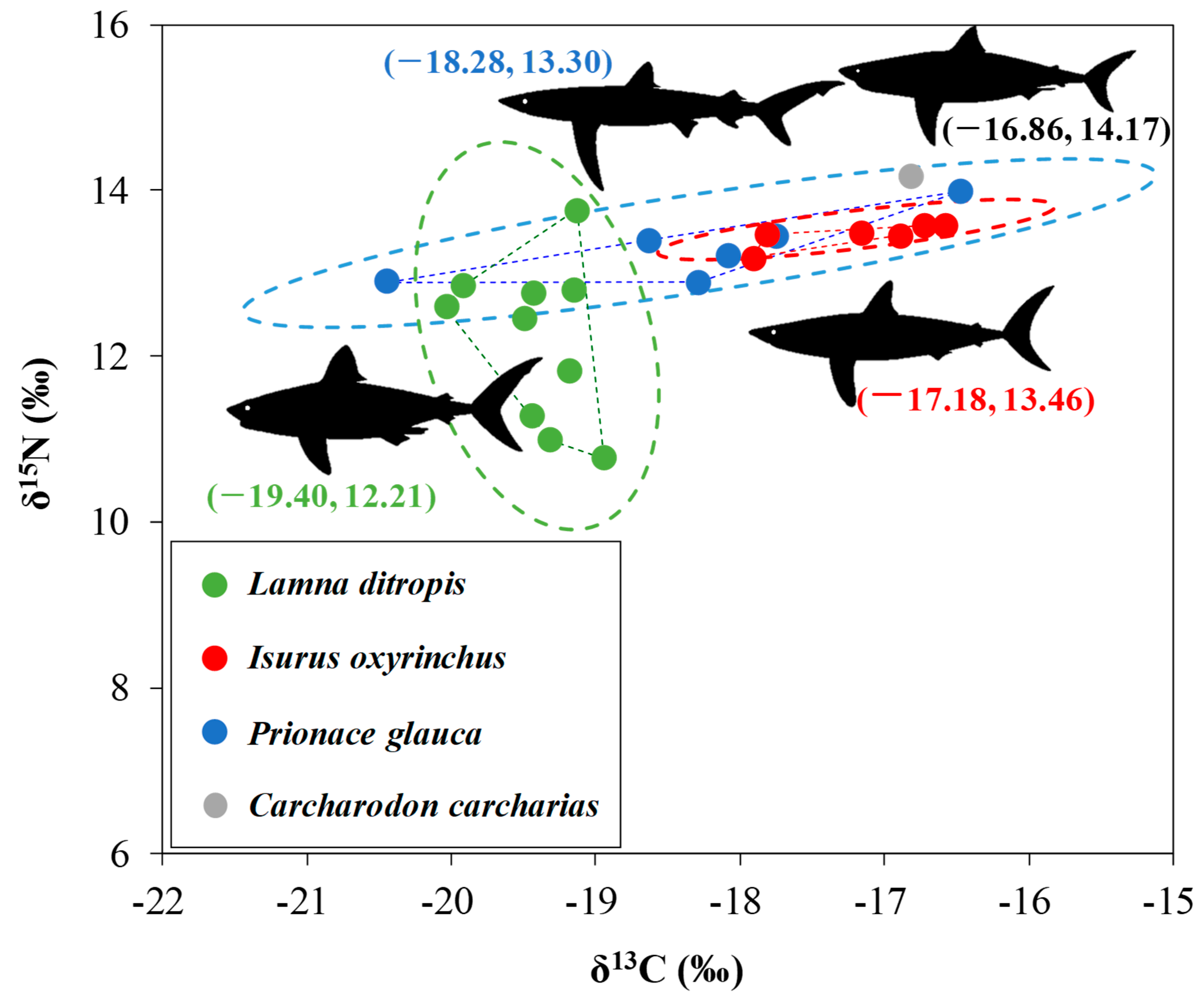 Lamna ditropis | 11 | 338.3 | 0.073 | −5.37 | 295.5–431.2 | 0.043–0.103 | −7.07–−4.07 |