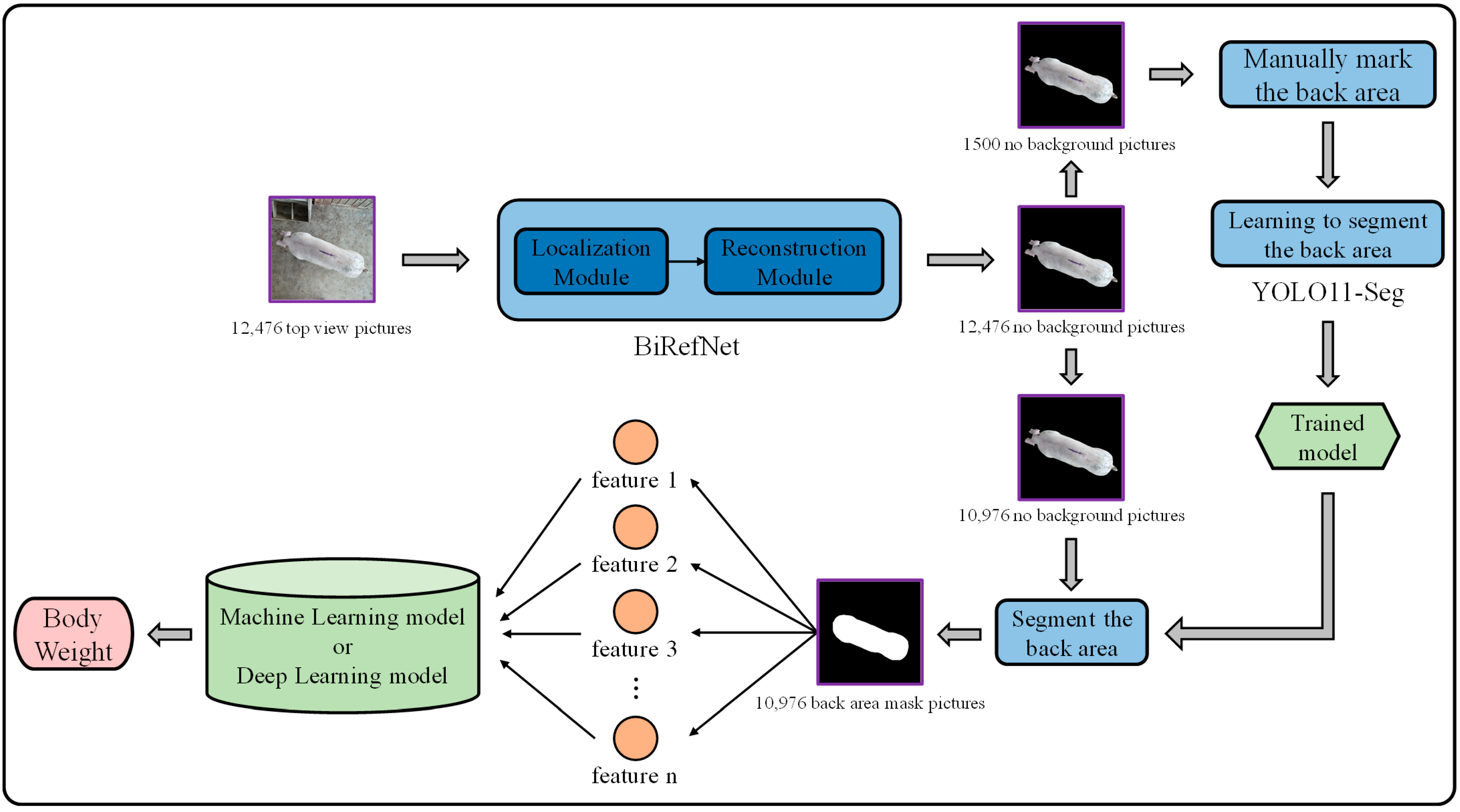 The main methodological workflow of this study is illustrated in Figure 2. First, BiRefNet [23] was used to remove the background regions and obtain the foreground images. Next, a subset of images was manually annotated for the dorsal region, and YOLOv11-seg was used to learn these regions. The resulting model was then applied to extract dorsal region masks for the remaining images. Features were subsequently extracted from these dorsal region mask images, and finally, these features were used to predict weight by comparing the results of various machine learning and deep learning models.