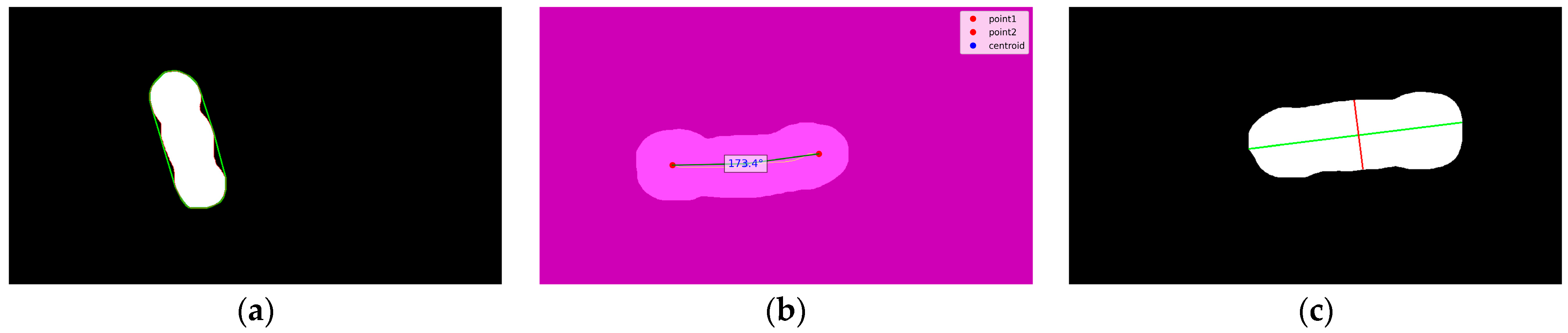 Figure 3. Illustration of Selected Features. (a) showcased the Convex Hull Area, the green line represents the smallest non-concave contour enclosing the mask region, the red line represents the external contour, (b) showcased the Body Curvature Angle, the two red dots are endpoints, the blue dot is the centroid of the skeleton, the yellow line represents the skeleton, and the green line represents the line connecting the two endpoints to the centroid, (c) showcased the Major and Minor Axes, the green line represents the Major Axes and the red line represents the Minor Axes.