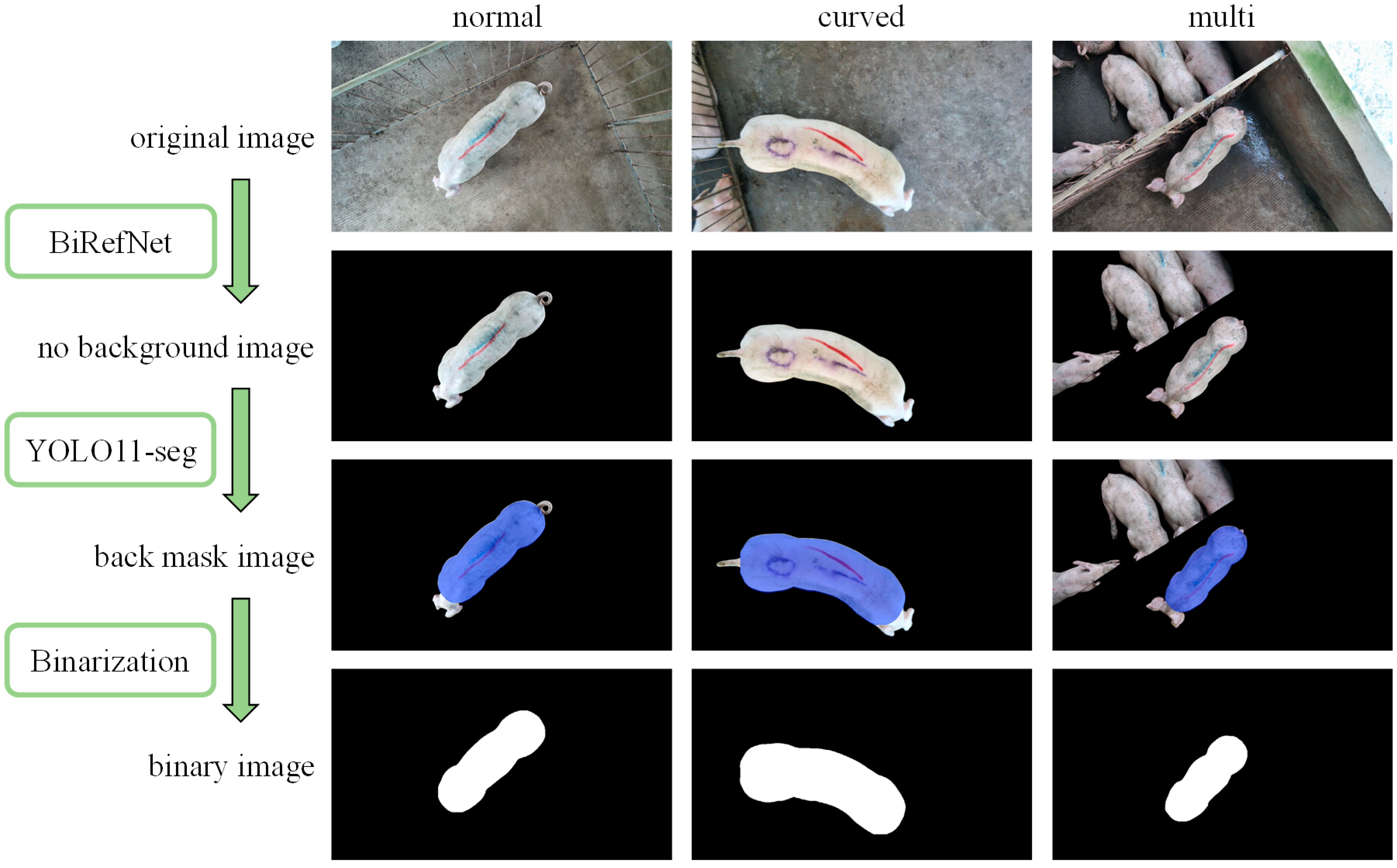 To accurately extract the pigs’ foreground regions, this study first employed the Bilateral Reference for High Resolution Dichotomous Image Segmentation (BiRefNet) framework [23] to perform background removal.