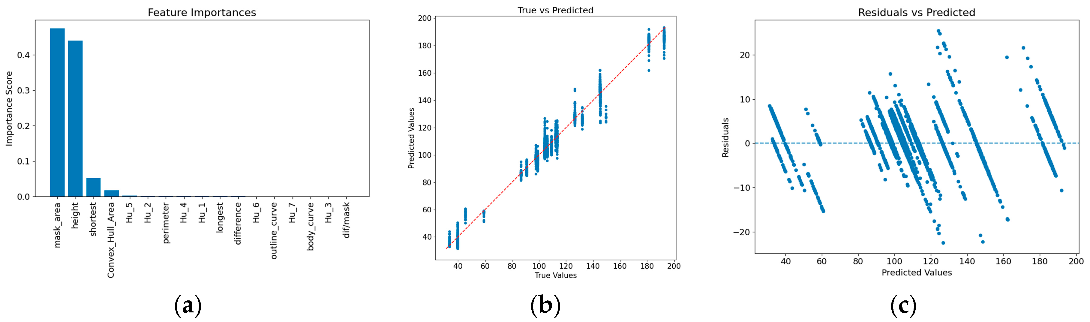 Figure 6. Visualization of the best-performing model. (a) Feature importance analysis, (b) Comparison between predicted and actual values, (c) Scatter plot of prediction residuals versus predicted values.