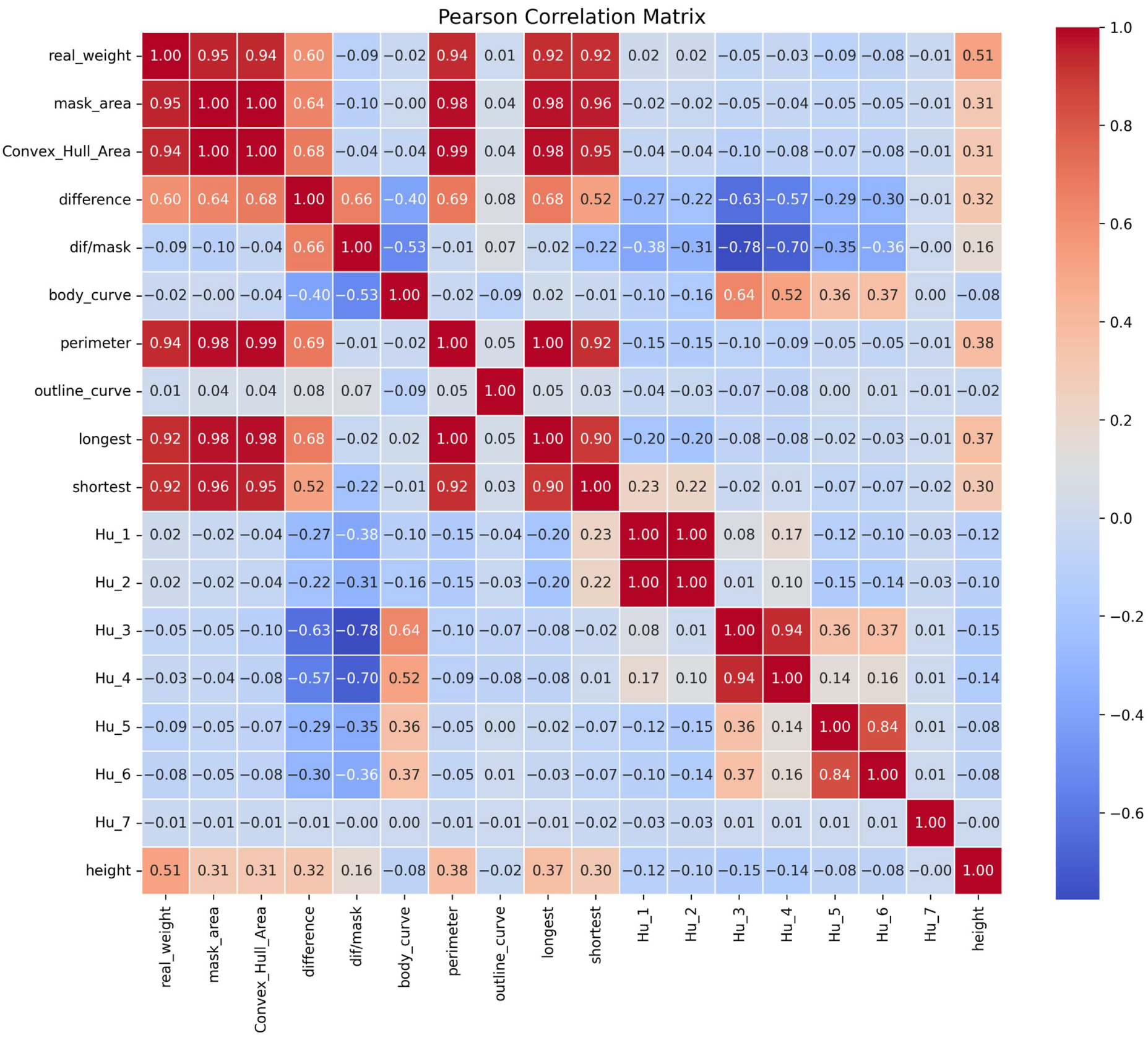 Figure 7. Heatmap displaying the Pearson correlation coefficients between each extracted feature and the pig’s body weight.