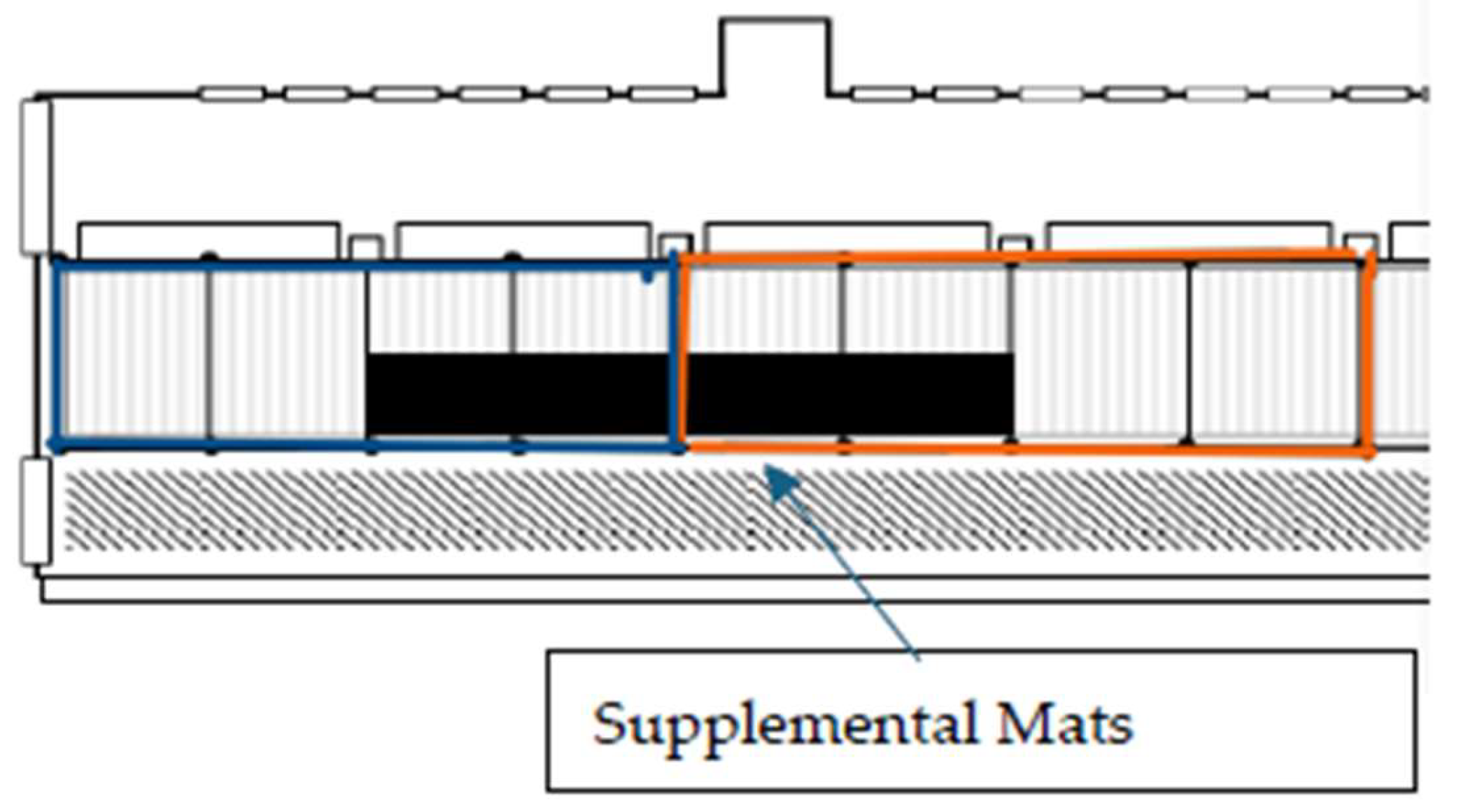 ® stall mats, QRRI Inc., Sandy Springs, GA, USA) were purchased from a local farm supply store. Eight mats were placed in each pen on top of the existing rubber-coated slats, arranged side by side, covering a 1.8 × 9.8 m area, representing approximately 19% of the pen space (