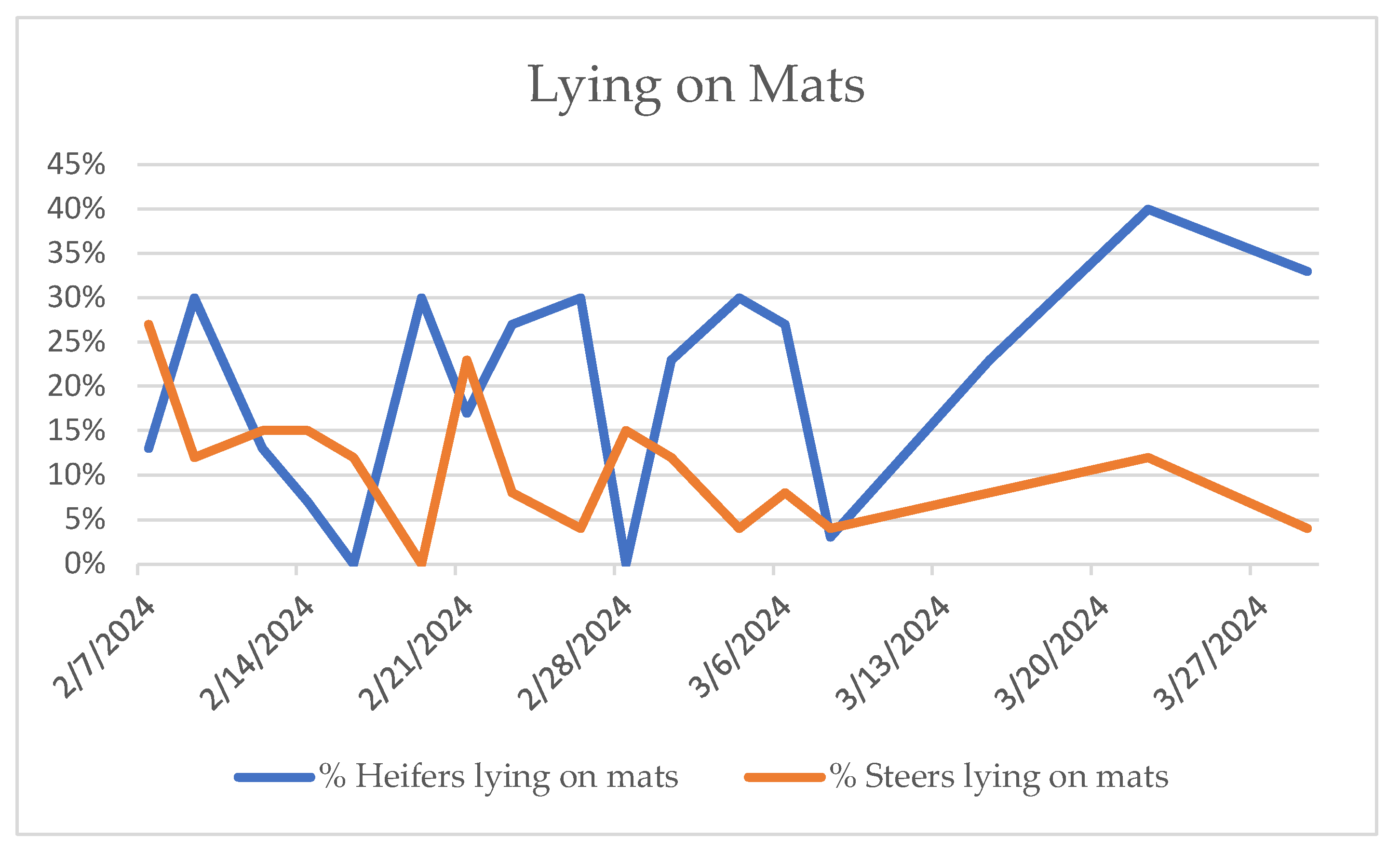 48]. The decision not to alter the farm’s daily cleaning routines in this study may have exacerbated this issue. In future studies, incorporating regular cleaning protocols, such as scraping or hosing down the mats, would be necessary to maintain a higher standard of animal cleanliness and welfare. Scraping was not implemented, because introducing a person into the pen would likely have impacted animal behavior; however, moving forward, this is the option we would use. There were several reasons hosing of the mats was not used to help keep the mats clean: the weather at that time of the year, the moisture from hosing, and the manure pits. February temperatures in our area of the country are typically between −6 °C and 3 °C, while in March, temperatures range between −1 °C and 10 °C [