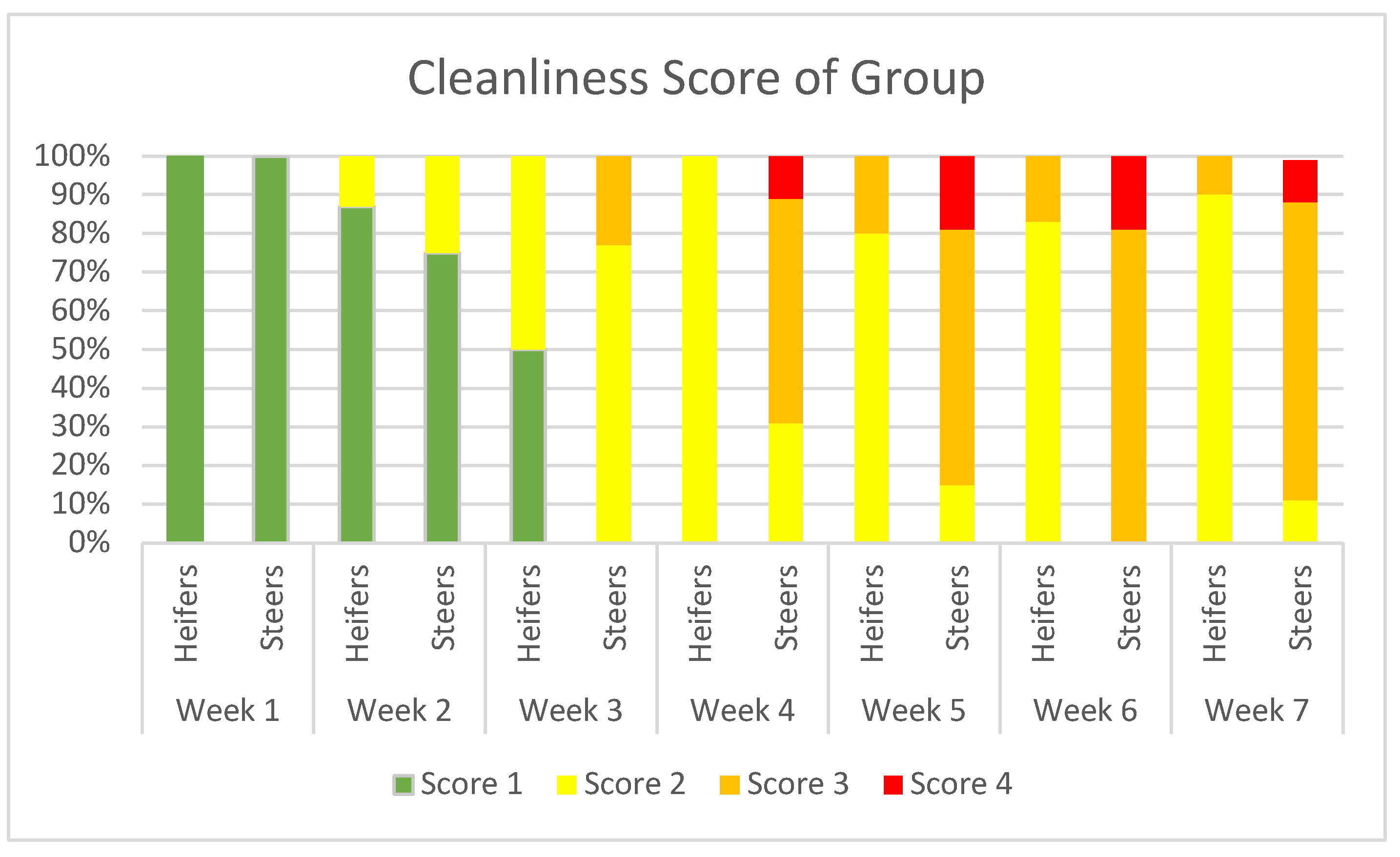 Cleanliness was noted to be a concern early in the trial. This observation became more evident in the steer pen as time went by. Estimates of the percentage of animals with various areas of their body covered with manure were recorded (hoof to knee, abdomen, rear legs, rump, and tail). Due to the large group sizes, individual scoring was not possible. Up to 50% of the heifers were dirty up to the knees by the end of the first week. By the end of the first month, almost all the heifers received a score of 2 or 3, and all the steers received scores of 3 or 4 (see