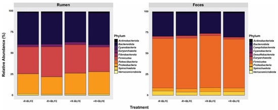 Relative abundances (%) of the 10 most abundant phyla in rumen fluid or feces of lactating cows receiving one of four dietary treatments: −R−BLFE (diet without both monensin and BLFE); −R+BLFE (diet with only BLFE), +R−BLFE (diet with only monensin); and +R+BLFE (diet with both monensin and BLFE).