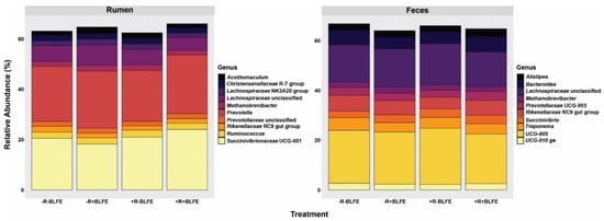 Relative abundances (%) of the 10 most abundant genera in rumen fluid and feces of lactating cows receiving one of four dietary treatments: −R−BLFE (diet without both monensin and BLFE); −R+BLFE (diet with only BLFE), +R−BLFE (diet with only monensin); and +R+BLFE (diet with both monensin and BLFE).