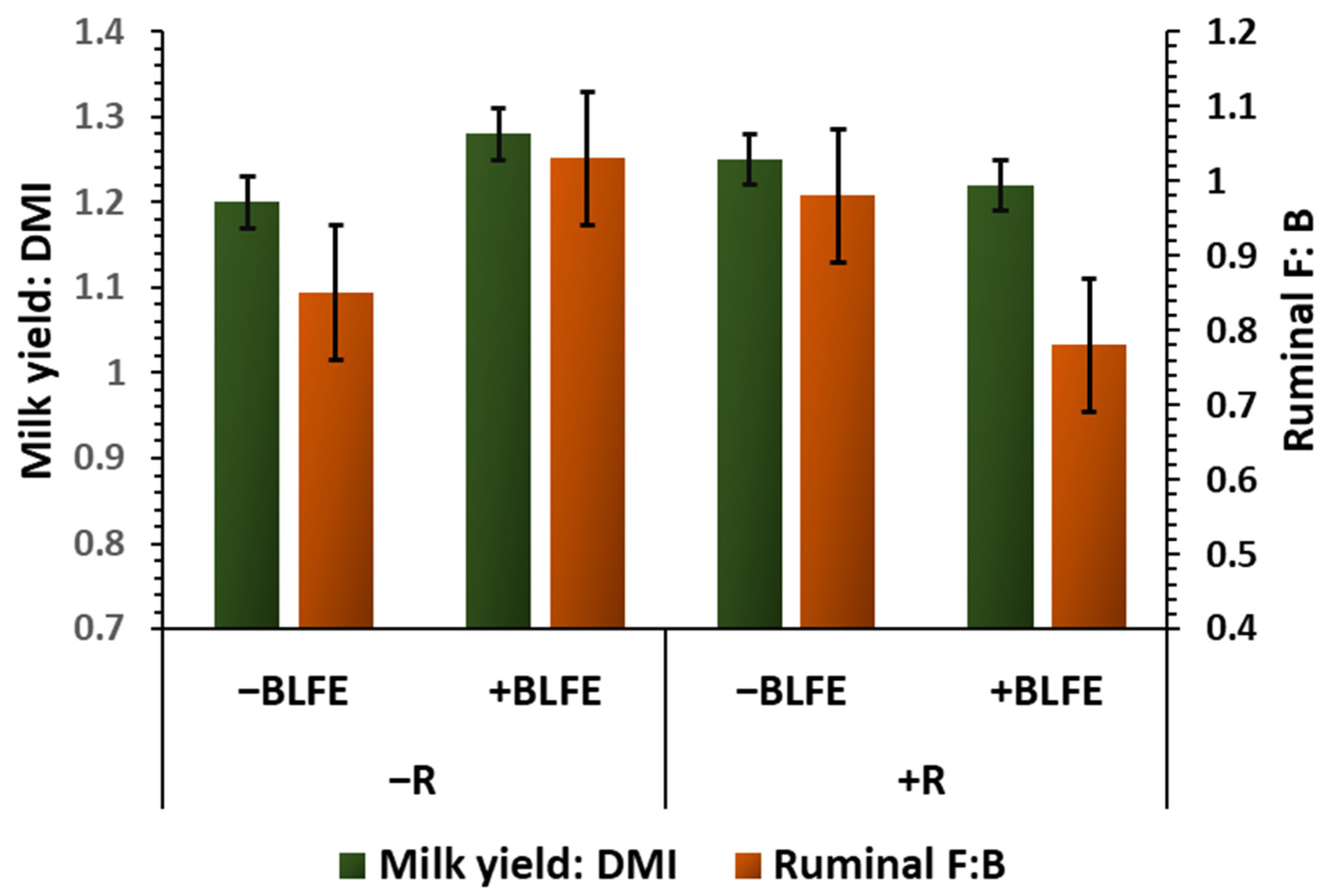 Milk yield/DMI 2 | 1.20 b | 1.28 a | 1.25 ab | 1.22 ab | 0.03 | 0.65 | 0.38 | 0.03 |