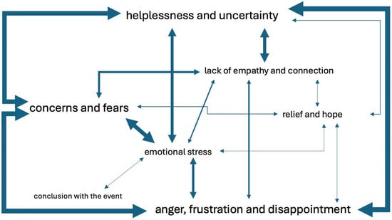 Concept map illustrating emotions identified in pet owners’ interviews concerning an error in veterinary medicine. The size of each label reflects how often that emotion was mentioned—larger labels indicate higher frequency. The thickness of the connecting lines represents how frequently two emotion categories were mentioned together—thicker lines denote a stronger co-occurrence.