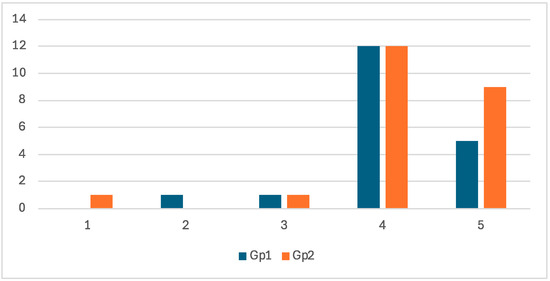 Among experimental group trainees, 40.5% (n = 17) in Gp1 and 50.0% (n = 21) in Gp 2 considered the simulator realistic compared to abattoir specimens, totaling 90.5% positive responses (n = 38). However, 4.8% (n = 2) expressed neutral perceptions and 4.8% (n = 2) provided negative evaluations, equally distributed between groups. The mean Likert score was 4.17 ± 0.82 (median = 4) (Figure 1). In contrast, all experts (100%, n = 14) provided positive evaluations, with 57.1% (n = 8) scoring 5 points and 42.9% (n = 6) scoring 4 points, yielding a higher mean score of 4.57 ± 0.50 (median = 5).